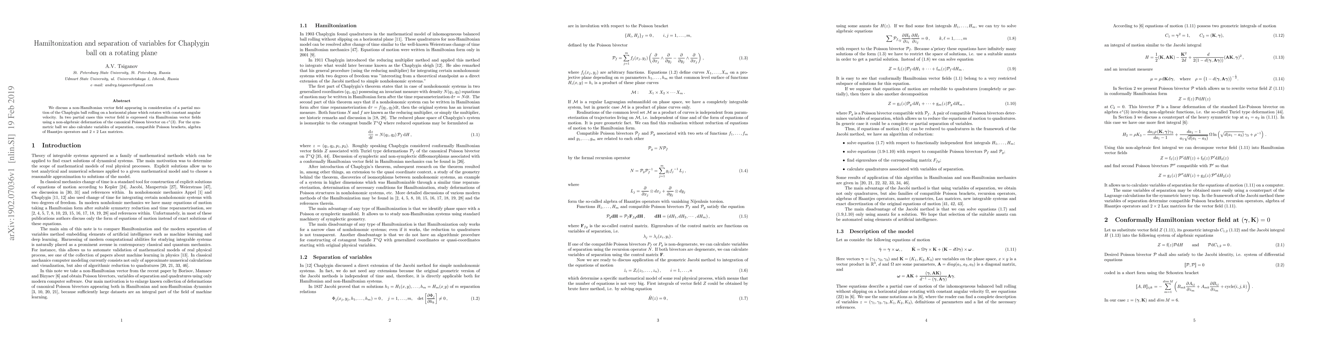 We discuss a non-Hamiltonian vector field appearing in consideration of a partial motion of the Chaplygin ball rolling on a horizontal plane which rotates with constant angular velocity. In two partial cases this vector field is expressed via Hamiltonian vector fields using a non-algebraic deformation of the canonical Poisson bivector on e^*(3). For the symmetric ball we also calculate variables of separation, compatible Poisson brackets, algebra of Haantjes operators and 2x2 Lax matrices.