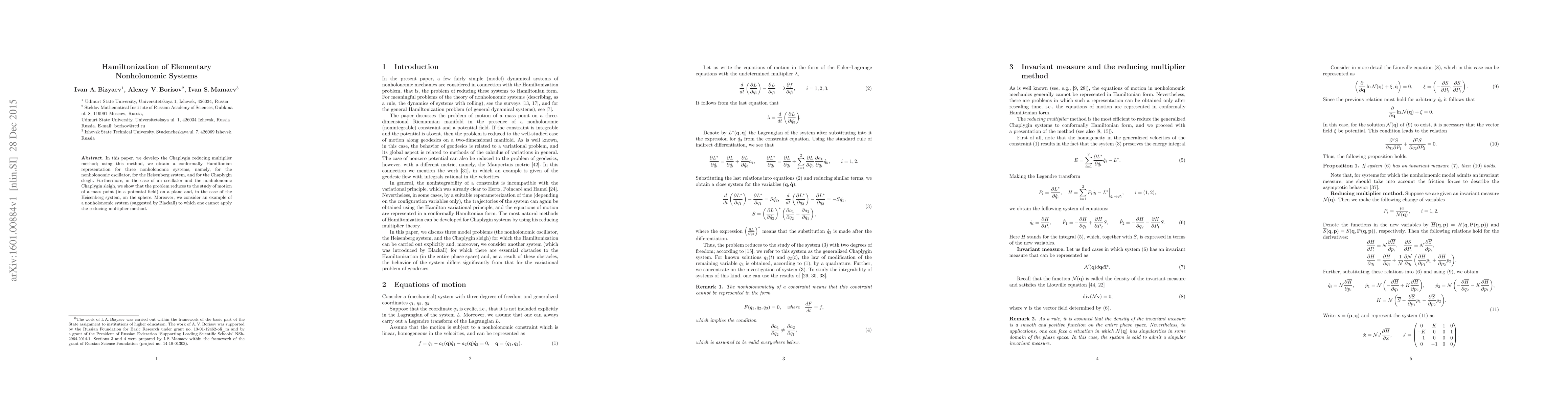 This paper develops the Chaplygin reducing multiplier method to obtain a conformally Hamiltonian representation for three nonholonomic systems: the nonholonomic oscillator, the Heisenberg system, and the Chaplygin sleigh. It demonstrates that these systems can be simplified to the motion of a mass point on a plane or sphere.