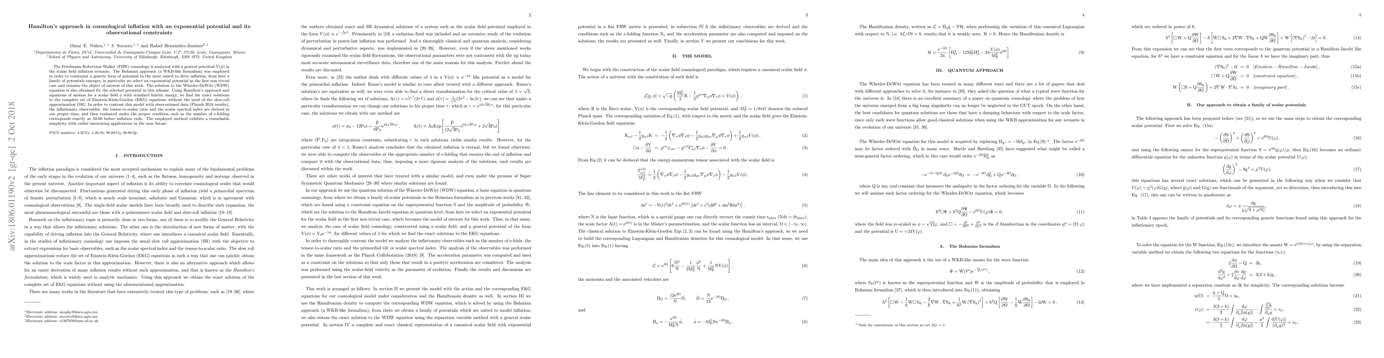 The Friedmann-Robertson-Walker (FRW) cosmology is analyzed with a general potential $\rm V(\phi)$ in the scalar field inflation scenario. The Bohmian approach (a WKB-like formalism) was employed in order to constraint a generic form of potential to the most suited to drive inflation, from here a family of potentials emerges; in particular we select an exponential potential as the first non trivial case and remains the object of interest of this work. The solution to the Wheeler-DeWitt (WDW) equation is also obtained for the selected potential in this scheme. Using Hamilton's approach and equations of motion for a scalar field $\rm \phi$ with standard kinetic energy, we find the exact solutions to the complete set of Einstein-Klein-Gordon (EKG) equations without the need of the slow-roll approximation (SR). In order to contrast this model with observational data (Planck 2018 results), the inflationary observables: the tensor-to-scalar ratio and the scalar spectral index are derived in our proper time, and then evaluated under the proper condition such as the number of e-folding corresponds exactly at 50-60 before inflation ends. The employed method exhibits a remarkable simplicity with rather interesting applications in the near future.