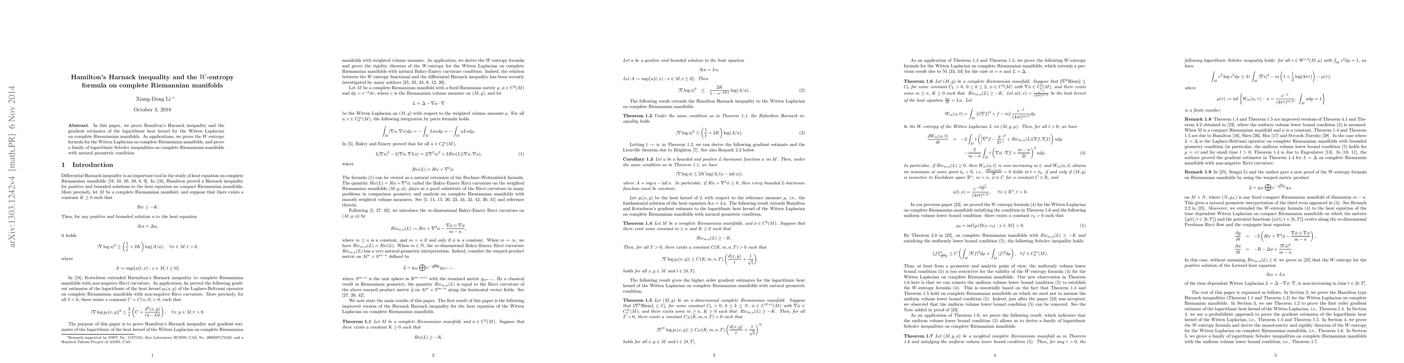 This paper proves Hamilton's Harnack inequality and gradient estimates for the logarithmic heat kernel on complete Riemannian manifolds, leading to the derivation of the $W$-entropy formula and a series of logarithmic Sobolev inequalities under specific geometric conditions.