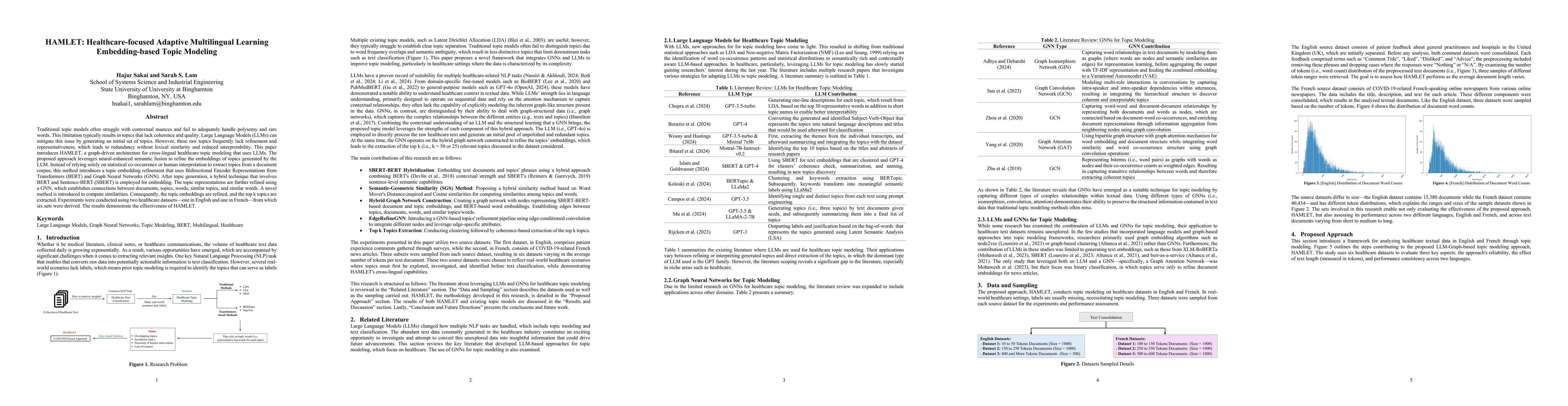 HAMLET presents a novel graph-driven architecture that combines LLMs, BERT, SBERT, and GNN for refined topic modeling in multilingual healthcare contexts.