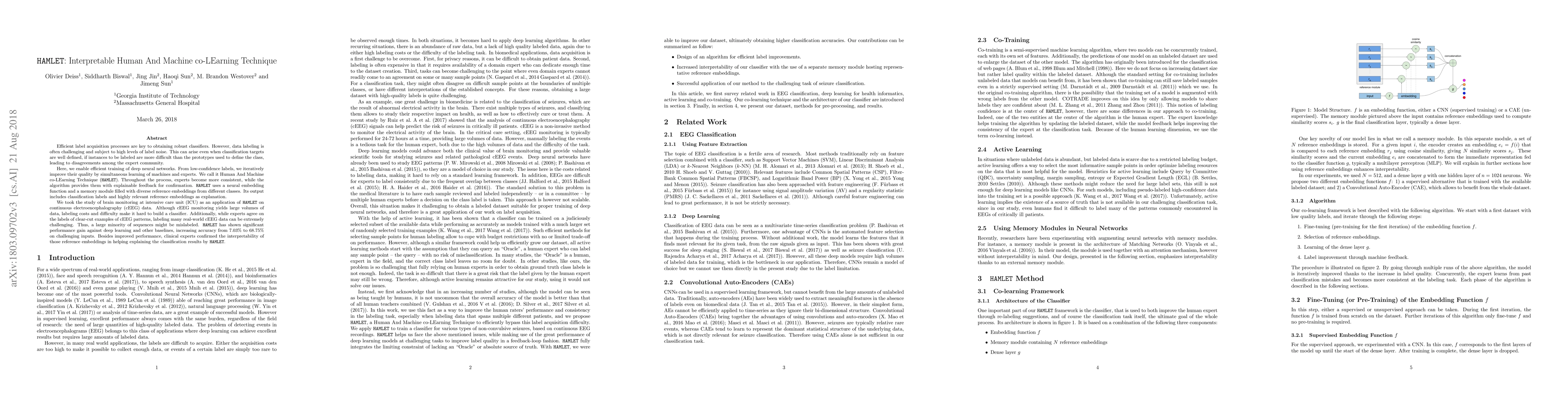 Efficient label acquisition processes are key to obtaining robust classifiers. However, data labeling is often challenging and subject to high levels of label noise. This can arise even when classification targets are well defined, if instances to be labeled are more difficult than the prototypes used to define the class, leading to disagreements among the expert community. Here, we enable efficient training of deep neural networks. From low-confidence labels, we iteratively improve their quality by simultaneous learning of machines and experts. We call it Human And Machine co-LEarning Technique (HAMLET). Throughout the process, experts become more consistent, while the algorithm provides them with explainable feedback for confirmation. HAMLET uses a neural embedding function and a memory module filled with diverse reference embeddings from different classes. Its output includes classification labels and highly relevant reference embeddings as explanation. We took the study of brain monitoring at intensive care unit (ICU) as an application of HAMLET on continuous electroencephalography (cEEG) data. Although cEEG monitoring yields large volumes of data, labeling costs and difficulty make it hard to build a classifier. Additionally, while experts agree on the labels of clear-cut examples of cEEG patterns, labeling many real-world cEEG data can be extremely challenging. Thus, a large minority of sequences might be mislabeled. HAMLET has shown significant performance gain against deep learning and other baselines, increasing accuracy from 7.03% to 68.75% on challenging inputs. Besides improved performance, clinical experts confirmed the interpretability of those reference embeddings in helping explaining the classification results by HAMLET.