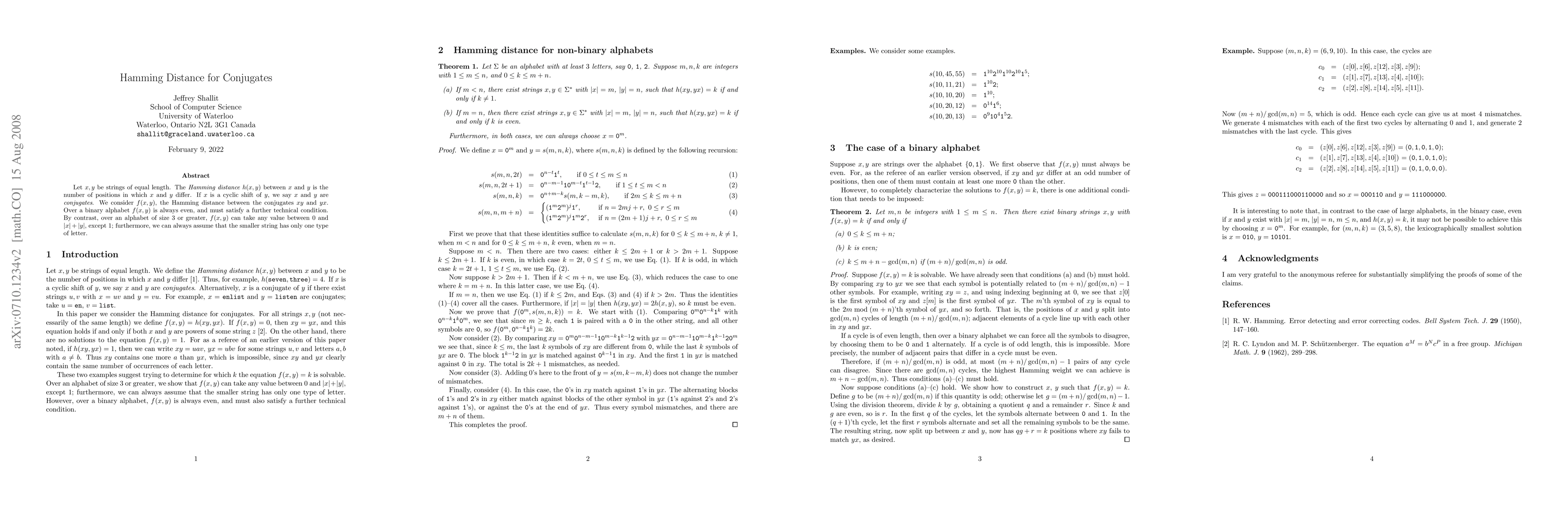 Let x, y be strings of equal length. The Hamming distance h(x,y) between x and y is the number of positions in which x and y differ. If x is a cyclic shift of y, we say x and y are conjugates. We consider f(x,y), the Hamming distance between the conjugates xy and yx. Over a binary alphabet f(x,y) is always even, and must satisfy a further technical condition. By contrast, over an alphabet of size 3 or greater, f(x,y) can take any value between 0 and |x|+|y|, except 1; furthermore, we can always assume that the smaller string has only one type of letter.