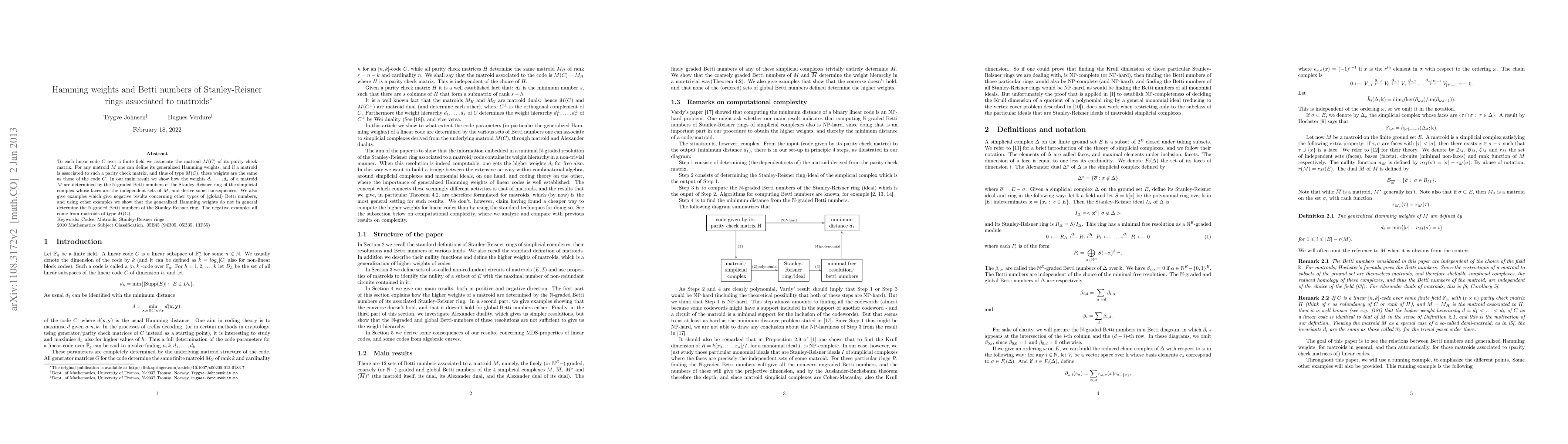 Summary: This research explores the relationship between generalized Hamming weights of linear codes and Betti numbers of Stanley-Reisner rings derived from matroids. It investigates how Betti numbers can inform about Hamming weights.