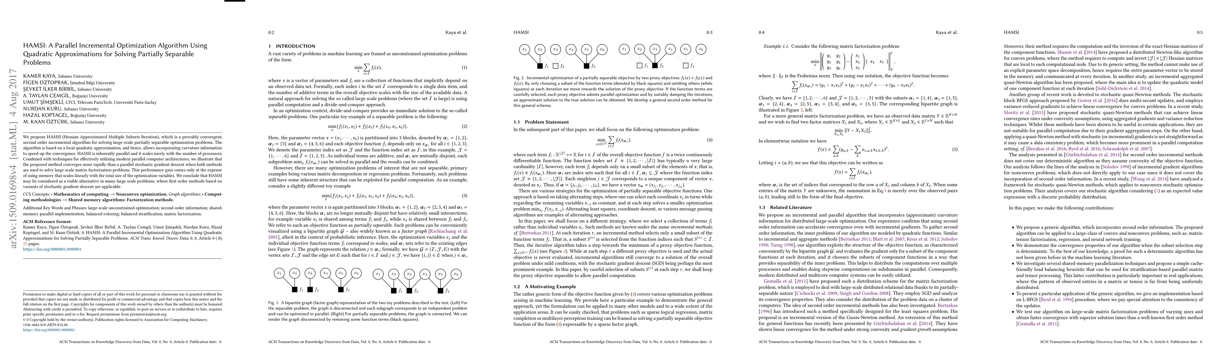 HAMSI is a parallel, second-order incremental optimization algorithm based on quadratic approximations for large-scale partially separable problems. It converges faster than parallel stochastic gradient descent in matrix factorization, demonstrating potential as an alternative to first-order methods.