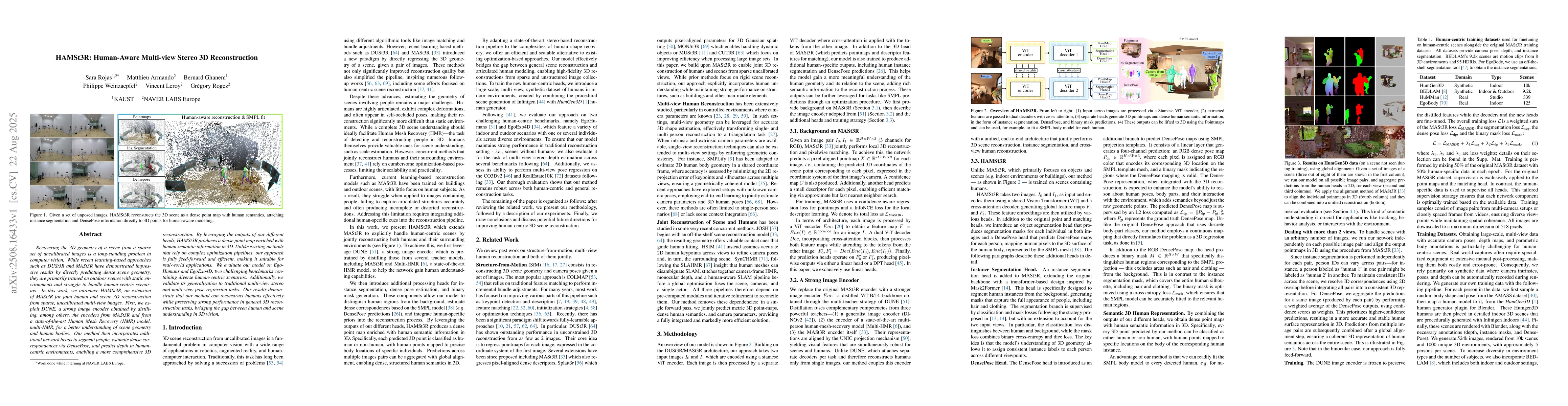 Recovering the 3D geometry of a scene from a sparse set of uncalibrated images is a long-standing problem in computer vision. While recent learning-based approaches such as DUSt3R and MASt3R have demonstrated impressive results by directly predicting dense scene geometry, they are primarily trained on outdoor scenes with static environments and struggle to handle human-centric scenarios. In this work, we introduce HAMSt3R, an extension of MASt3R for joint human and scene 3D reconstruction from sparse, uncalibrated multi-view images. First, we exploit DUNE, a strong image encoder obtained by distilling, among others, the encoders from MASt3R and from a state-of-the-art Human Mesh Recovery (HMR) model, multi-HMR, for a better understanding of scene geometry and human bodies. Our method then incorporates additional network heads to segment people, estimate dense correspondences via DensePose, and predict depth in human-centric environments, enabling a more comprehensive 3D reconstruction. By leveraging the outputs of our different heads, HAMSt3R produces a dense point map enriched with human semantic information in 3D. Unlike existing methods that rely on complex optimization pipelines, our approach is fully feed-forward and efficient, making it suitable for real-world applications. We evaluate our model on EgoHumans and EgoExo4D, two challenging benchmarks con taining diverse human-centric scenarios. Additionally, we validate its generalization to traditional multi-view stereo and multi-view pose regression tasks. Our results demonstrate that our method can reconstruct humans effectively while preserving strong performance in general 3D reconstruction tasks, bridging the gap between human and scene understanding in 3D vision.