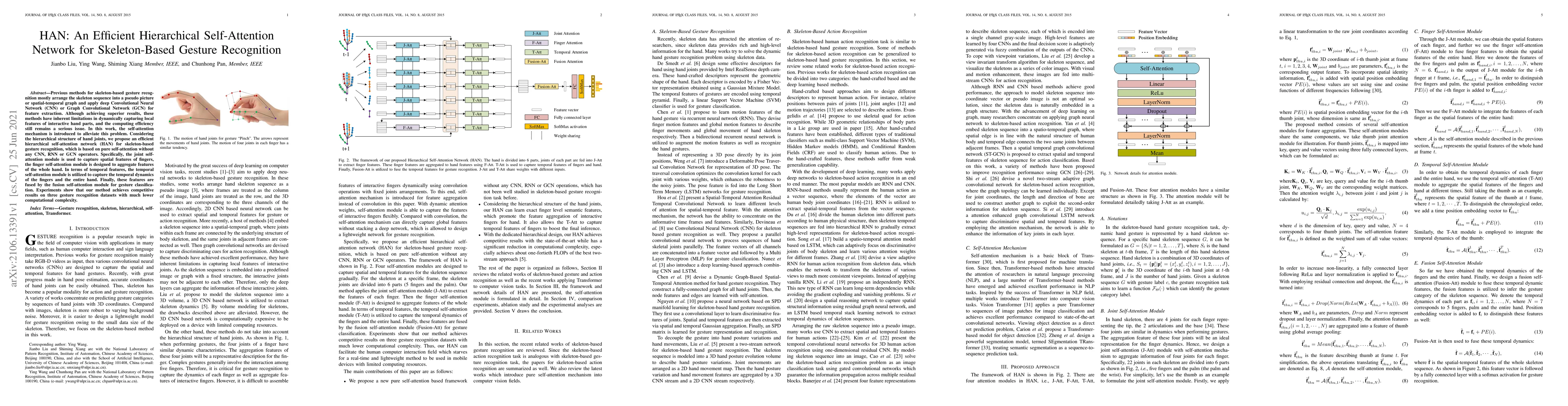 The paper proposes HAN, a hierarchical self-attention network for skeleton-based gesture recognition, which uses self-attention mechanisms to capture spatial and temporal features without relying on CNNs, RNNs, or GCNs, achieving competitive results with lower computational complexity.