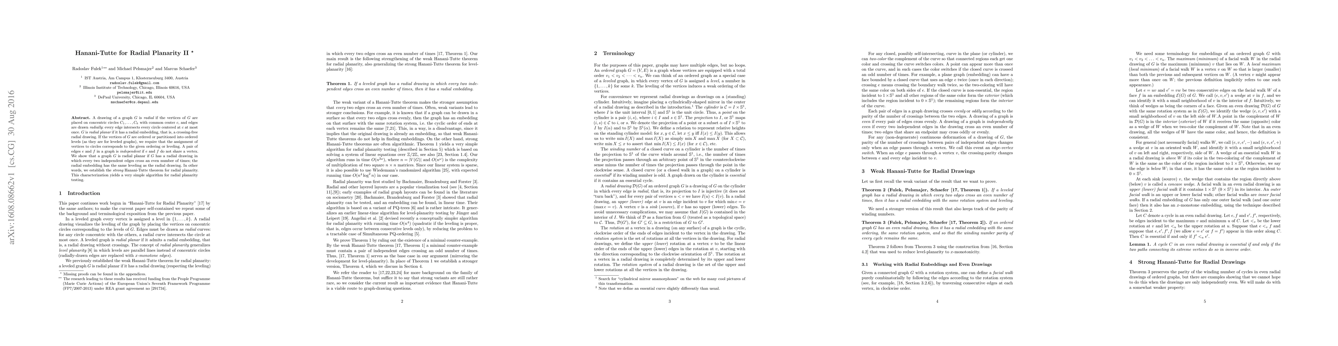 A drawing of a graph $G$ is radial if the vertices of $G$ are placed on concentric circles $C_1, \ldots, C_k$ with common center $c$, and edges are drawn radially: every edge intersects every circle centered at $c$ at most once. $G$ is radial planar if it has a radial embedding, that is, a crossing-free radial drawing. If the vertices of $G$ are ordered or partitioned into ordered levels (as they are for leveled graphs), we require that the assignment of vertices to circles corresponds to the given ordering or leveling. A pair of edges $e$ and $f$ in a graph is independent if $e$ and $f$ do not share a vertex. We show that a graph $G$ is radial planar if $G$ has a radial drawing in which every two independent edges cross an even number of times; the radial embedding has the same leveling as the radial drawing. In other words, we establish the strong Hanani-Tutte theorem for radial planarity. This characterization yields a very simple algorithm for radial planarity testing.