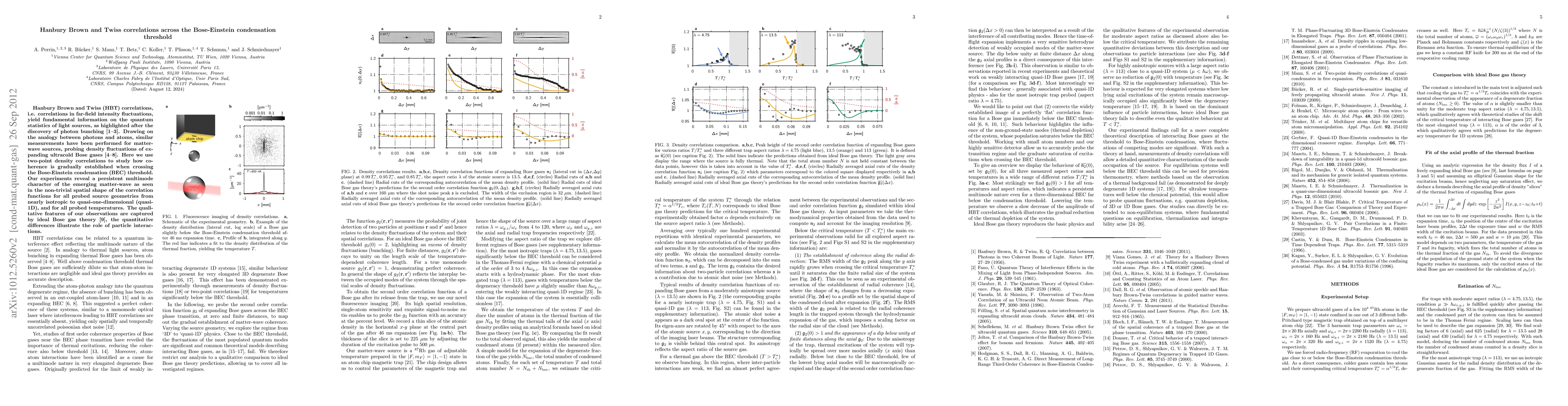 Hanbury Brown and Twiss (HBT) correlations, i.e. correlations in far-field intensity fluctuations, yield fundamental information on the quantum statistics of light sources, as highlighted after the discovery of photon bunching. Drawing on the analogy between photons and atoms, similar measurements have been performed for matter-wave sources, probing density fluctuations of expanding ultracold Bose gases. Here we use two-point density correlations to study how coherence is gradually established when crossing the Bose-Einstein condensation (BEC) threshold. Our experiments reveal a persistent multimode character of the emerging matter-wave as seen in the non-trivial spatial shape of the correlation functions for all probed source geometries from nearly isotropic to quasi-one-dimensional (quasi-1D), and for all probed temperatures. The qualitative features of our observations are captured by ideal Bose gas theory, the quantitative differences illustrate the role of particle interactions.