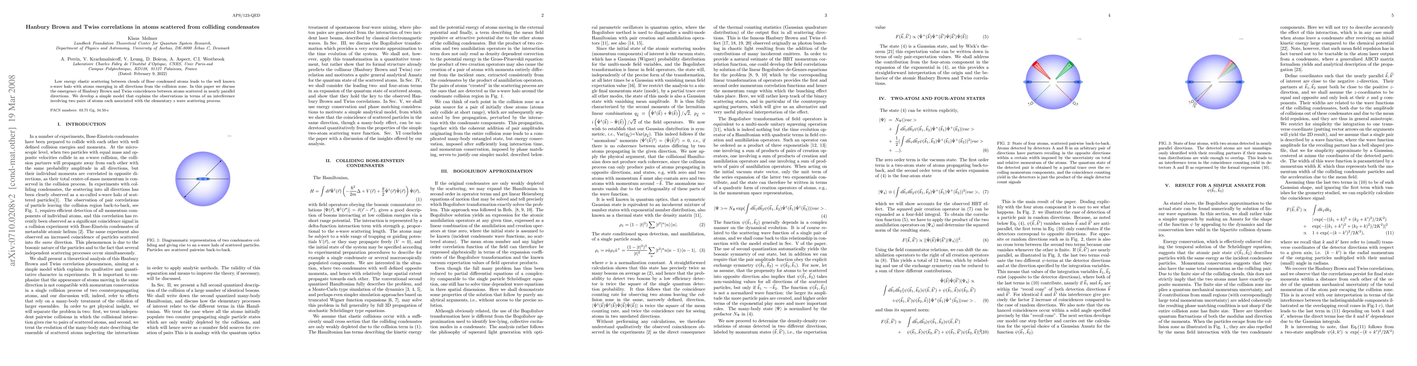 Researchers discovered Hanbury Brown and Twiss coincidences in atoms scattered from colliding Bose condensates, suggesting an interference pattern involving two pairs of atoms associated with s-wave scattering.