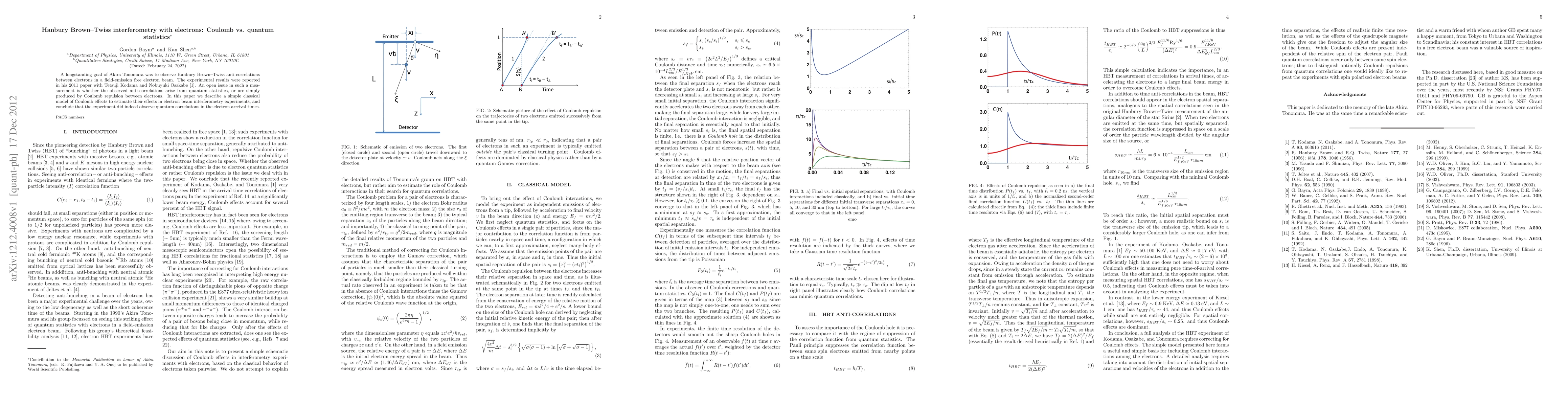 A longstanding goal of Akira Tonomura was to observe Hanbury Brown--Twiss anti-correlations between electrons in a field-emission free electron beam. The experimental results were reported in his 2011 paper with Tetsuji Kodama and Nobuyuki Osakabe [Phys. Rev. A 83, 063616 (2011)]. An open issue in such a measurement is whether the observed anti-correlations arise from quantum statistics, or are simply produced by Coulomb repulsion between electrons. In this paper we describe a simple classical model of Coulomb effects to estimate their effects in electron beam interferometry experiments, and conclude that the experiment did indeed observe quantum correlations in the electron arrrival times.