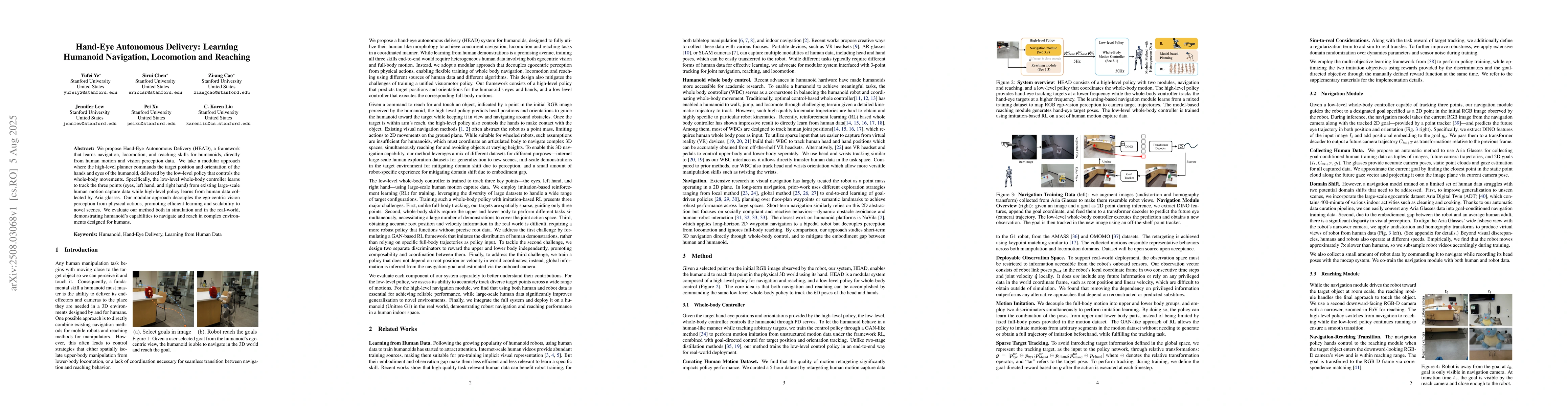 We propose Hand-Eye Autonomous Delivery (HEAD), a framework that learns navigation, locomotion, and reaching skills for humanoids, directly from human motion and vision perception data. We take a modular approach where the high-level planner commands the target position and orientation of the hands and eyes of the humanoid, delivered by the low-level policy that controls the whole-body movements. Specifically, the low-level whole-body controller learns to track the three points (eyes, left hand, and right hand) from existing large-scale human motion capture data while high-level policy learns from human data collected by Aria glasses. Our modular approach decouples the ego-centric vision perception from physical actions, promoting efficient learning and scalability to novel scenes. We evaluate our method both in simulation and in the real-world, demonstrating humanoid's capabilities to navigate and reach in complex environments designed for humans.