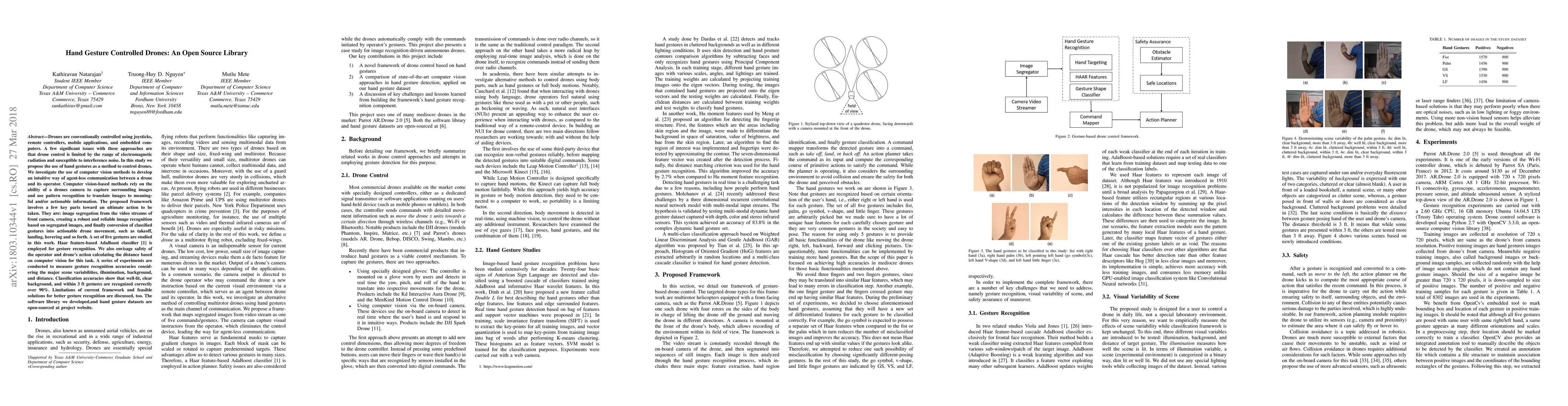 Drones are conventionally controlled using joysticks, remote controllers, mobile applications, and embedded computers. A few significant issues with these approaches are that drone control is limited by the range of electromagnetic radiation and susceptible to interference noise. In this study we propose the use of hand gestures as a method to control drones. We investigate the use of computer vision methods to develop an intuitive way of agent-less communication between a drone and its operator. Computer vision-based methods rely on the ability of a drone's camera to capture surrounding images and use pattern recognition to translate images to meaningful and/or actionable information. The proposed framework involves a few key parts toward an ultimate action to be taken. They are: image segregation from the video streams of front camera, creating a robust and reliable image recognition based on segregated images, and finally conversion of classified gestures into actionable drone movement, such as takeoff, landing, hovering and so forth. A set of five gestures are studied in this work. Haar feature-based AdaBoost classifier is employed for gesture recognition. We also envisage safety of the operator and drone's action calculating the distance based on computer vision for this task. A series of experiments are conducted to measure gesture recognition accuracies considering the major scene variabilities, illumination, background, and distance. Classification accuracies show that well-lit, clear background, and within 3 ft gestures are recognized correctly over 90%. Limitations of current framework and feasible solutions for better gesture recognition are discussed, too. The software library we developed, and hand gesture data sets are open-sourced at project website.