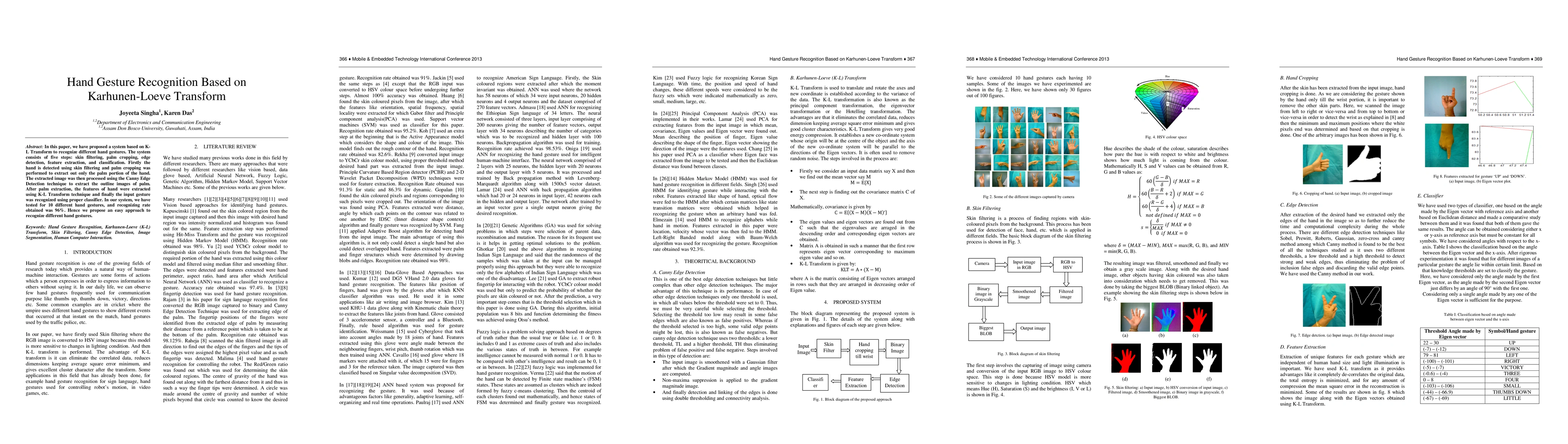 In this paper, we have proposed a system based on K-L Transform to recognize different hand gestures. The system consists of five steps: skin filtering, palm cropping, edge detection, feature extraction, and classification. Firstly the hand is detected using skin filtering and palm cropping was performed to extract out only the palm portion of the hand. The extracted image was then processed using the Canny Edge Detection technique to extract the outline images of palm. After palm extraction, the features of hand were extracted using K-L Transform technique and finally the input gesture was recognized using proper classifier. In our system, we have tested for 10 different hand gestures, and recognizing rate obtained was 96%. Hence we propose an easy approach to recognize different hand gestures.