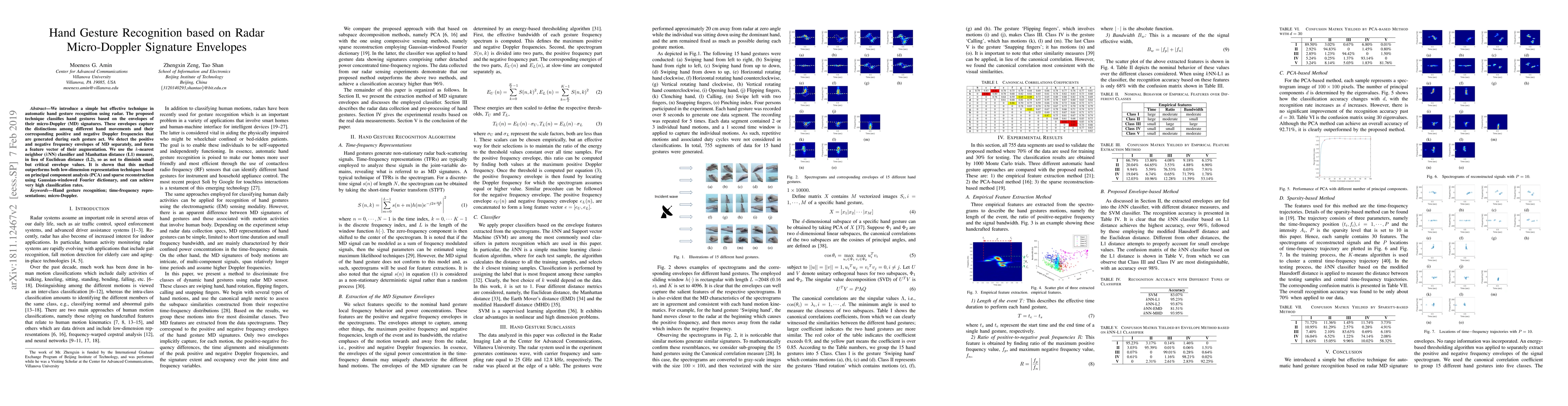 This paper proposes a radar-based hand gesture recognition method that uses micro-Doppler signature envelopes to classify gestures. It employs a $k$-nearest neighbor classifier with Manhattan distance, achieving higher classification rates than PCA and sparse reconstruction techniques.