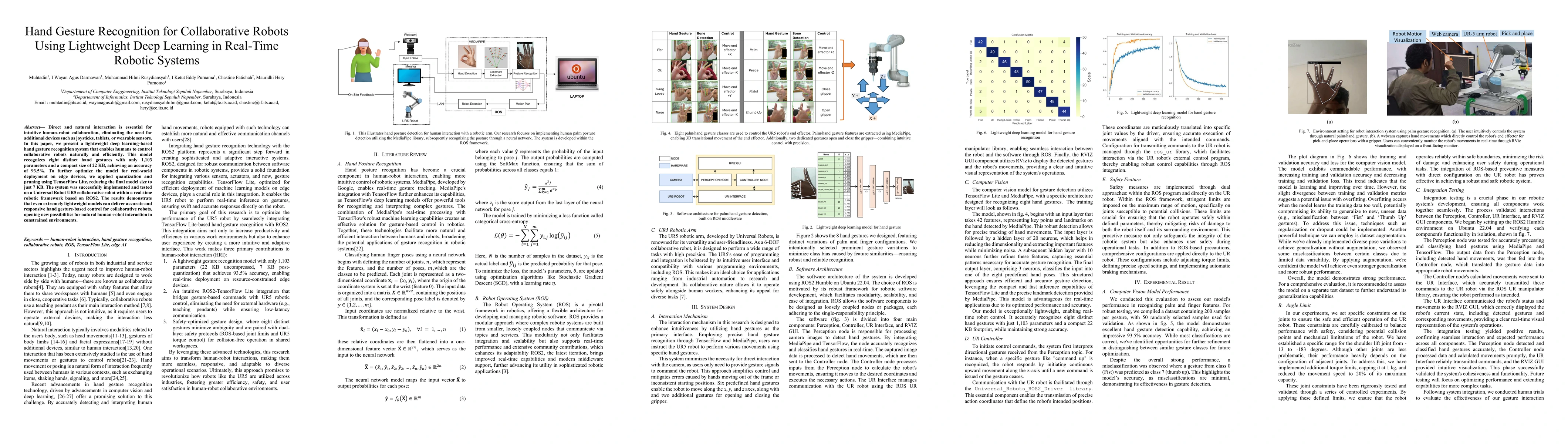 Direct and natural interaction is essential for intuitive human-robot collaboration, eliminating the need for additional devices such as joysticks, tablets, or wearable sensors. In this paper, we present a lightweight deep learning-based hand gesture recognition system that enables humans to control collaborative robots naturally and efficiently. This model recognizes eight distinct hand gestures with only 1,103 parameters and a compact size of 22 KB, achieving an accuracy of 93.5%. To further optimize the model for real-world deployment on edge devices, we applied quantization and pruning using TensorFlow Lite, reducing the final model size to just 7 KB. The system was successfully implemented and tested on a Universal Robot UR5 collaborative robot within a real-time robotic framework based on ROS2. The results demonstrate that even extremely lightweight models can deliver accurate and responsive hand gesture-based control for collaborative robots, opening new possibilities for natural human-robot interaction in constrained environments.