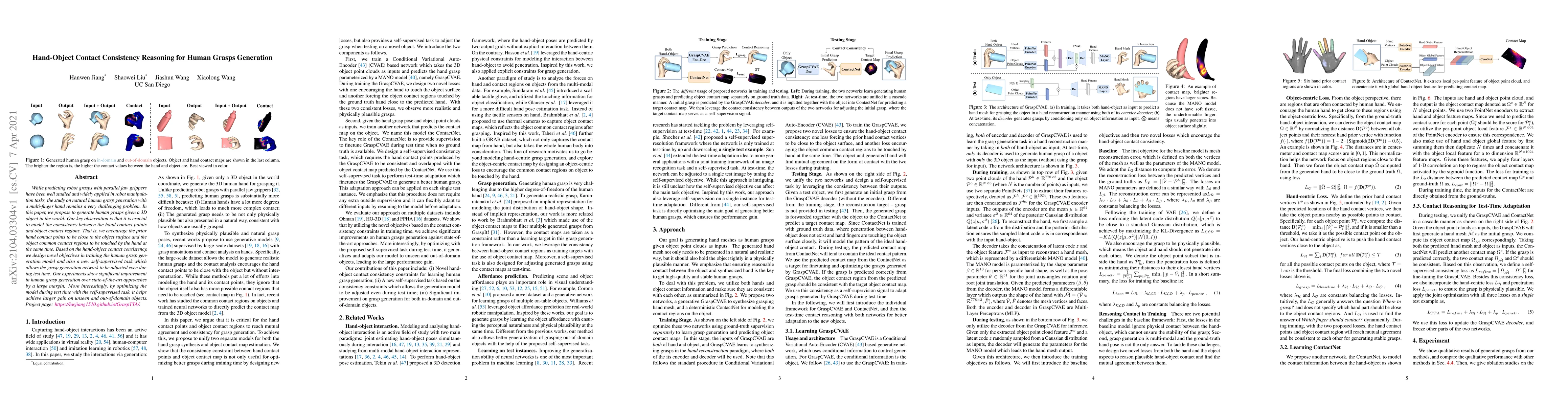 This paper proposes a method to generate human grasps for multi-finger hands by modeling the consistency between hand contact points and object contact regions. The approach includes novel training objectives and a self-supervised task for model adjustment during testing, achieving significant improvements over existing methods, especially for unseen objects.