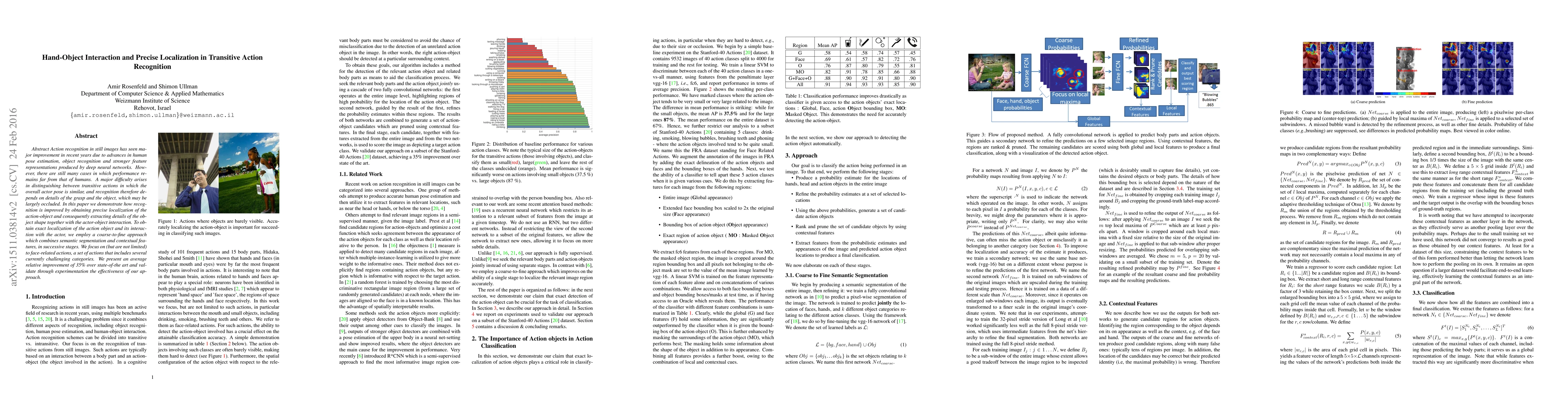 Action recognition in still images has seen major improvement in recent years due to advances in human pose estimation, object recognition and stronger feature representations produced by deep neural networks. However, there are still many cases in which performance remains far from that of humans. A major difficulty arises in distinguishing between transitive actions in which the overall actor pose is similar, and recognition therefore depends on details of the grasp and the object, which may be largely occluded. In this paper we demonstrate how recognition is improved by obtaining precise localization of the action-object and consequently extracting details of the object shape together with the actor-object interaction. To obtain exact localization of the action object and its interaction with the actor, we employ a coarse-to-fine approach which combines semantic segmentation and contextual features, in successive stages. We focus on (but are not limited) to face-related actions, a set of actions that includes several currently challenging categories. We present an average relative improvement of 35% over state-of-the art and validate through experimentation the effectiveness of our approach.