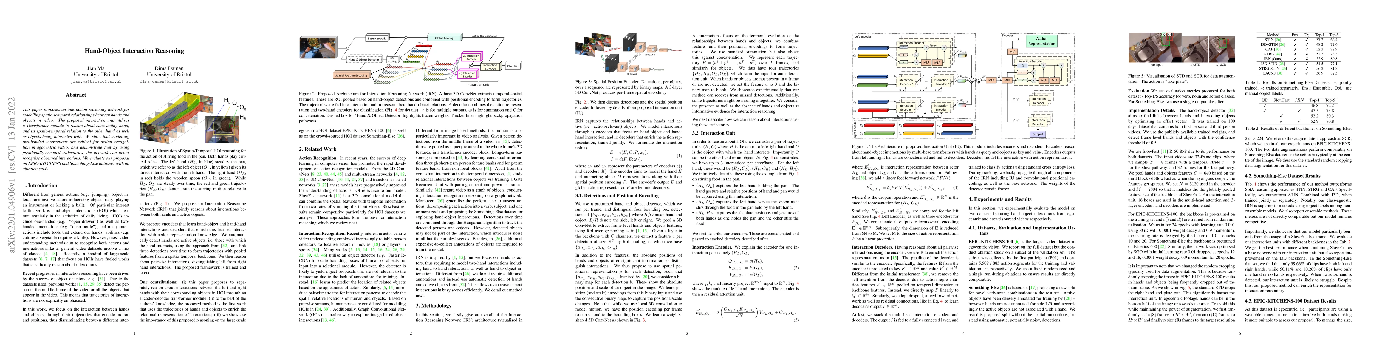 This paper proposes an interaction reasoning network for modelling spatio-temporal relationships between hands and objects in video. The proposed interaction unit utilises a Transformer module to reason about each acting hand, and its spatio-temporal relation to the other hand as well as objects being interacted with. We show that modelling two-handed interactions are critical for action recognition in egocentric video, and demonstrate that by using positionally-encoded trajectories, the network can better recognise observed interactions. We evaluate our proposal on EPIC-KITCHENS and Something-Else datasets, with an ablation study.