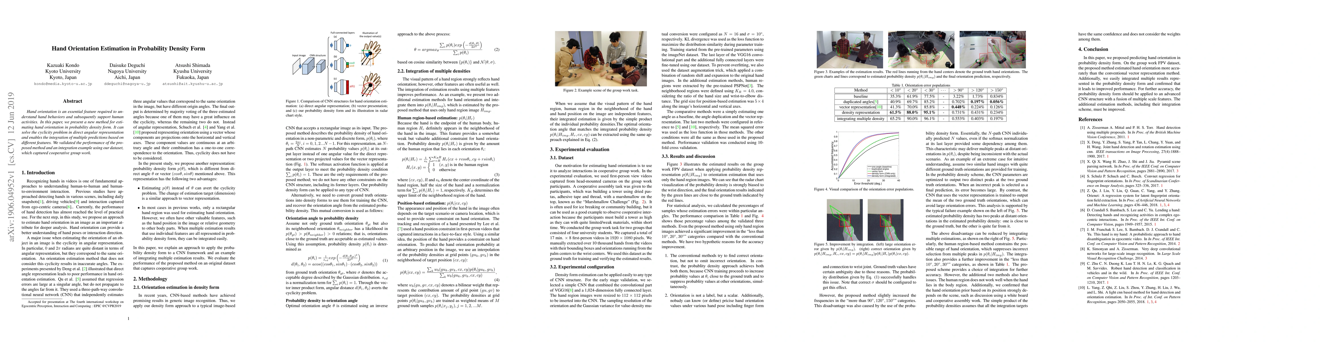This paper proposes a new method to estimate hand orientation in probability density form, solving the cyclicity problem and enabling integration of multiple predictions, with promising results on a cooperative group work dataset.