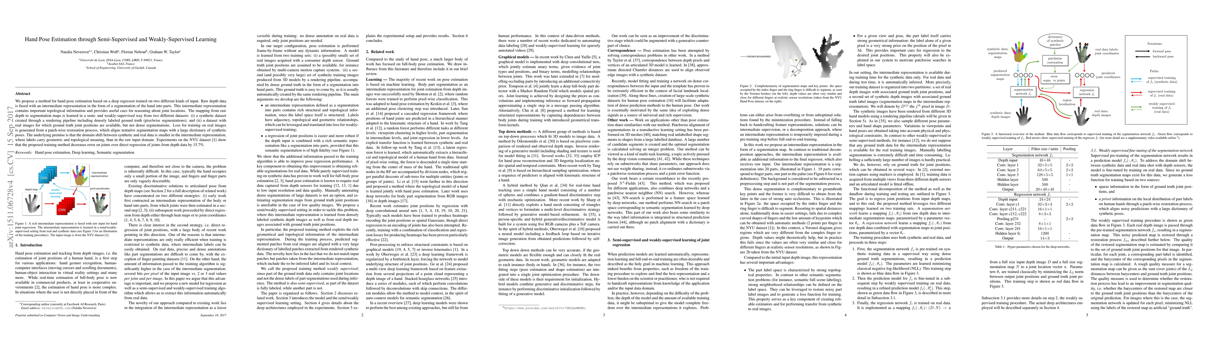 This paper proposes a semi-supervised and weakly-supervised learning method for hand pose estimation using a deep regressor that fuses raw depth data with hand segmentation maps. The method leverages synthetic and real datasets to learn the mapping from depth to segmentation, reducing joint estimation error by 15.7% on the NYU dataset.