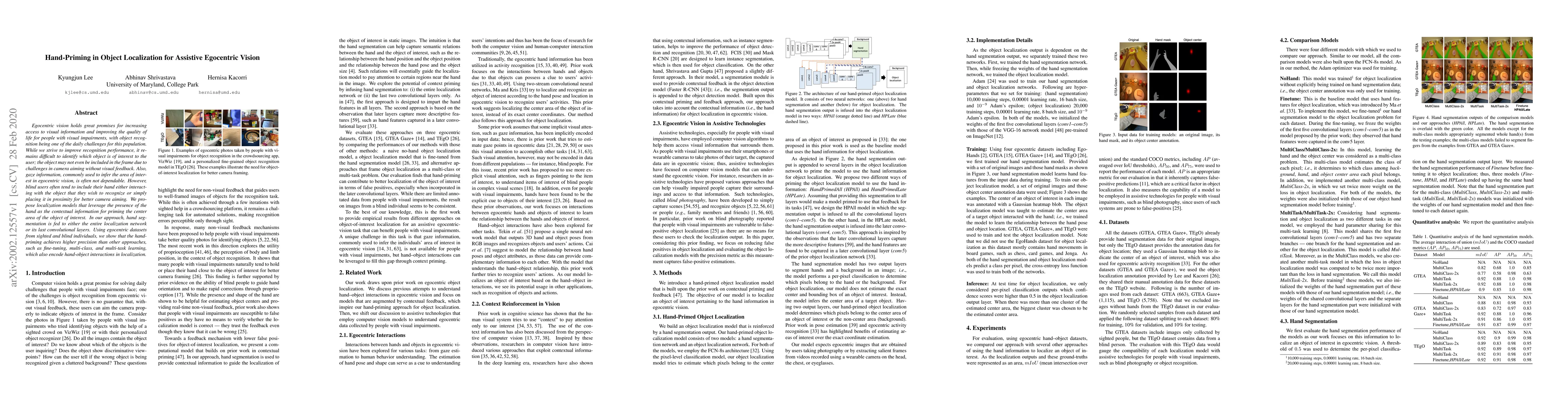 This paper proposes a localization model that uses hand segmentation to prime the center area of objects of interest in assistive egocentric vision, improving recognition for visually impaired users. The approach shows higher precision compared to other methods, leveraging the hand's presence as contextual information to enhance object localization.