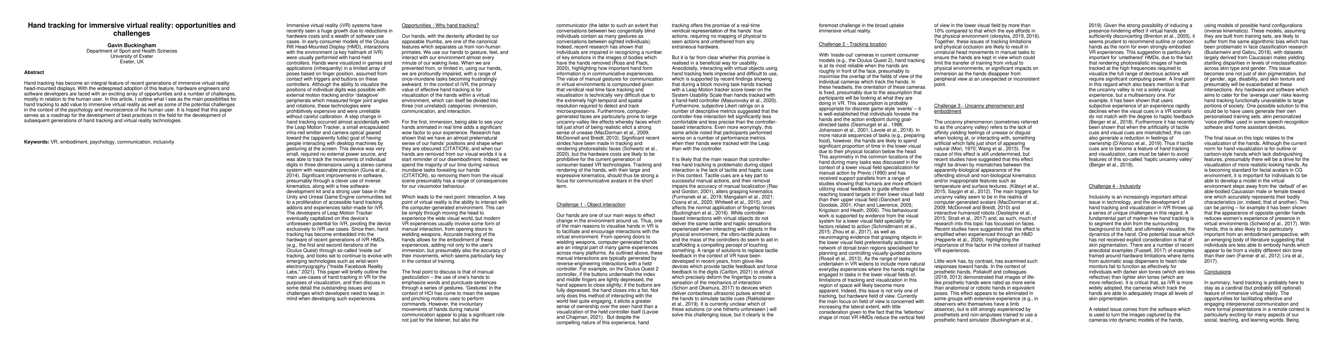 This paper explores the potential of hand tracking in immersive virtual reality, highlighting its value-adding opportunities while also addressing the psychological and neuroscientific challenges it presents for users. It aims to guide future best practices in hand tracking technology development.