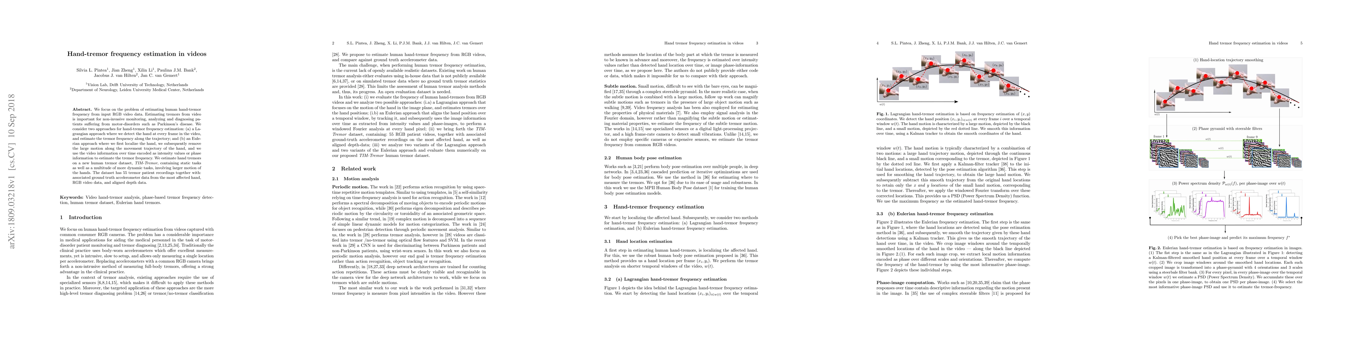 We focus on the problem of estimating human hand-tremor frequency from input RGB video data. Estimating tremors from video is important for non-invasive monitoring, analyzing and diagnosing patients suffering from motor-disorders such as Parkinson's disease. We consider two approaches for hand-tremor frequency estimation: (a) a Lagrangian approach where we detect the hand at every frame in the video, and estimate the tremor frequency along the trajectory; and (b) an Eulerian approach where we first localize the hand, we subsequently remove the large motion along the movement trajectory of the hand, and we use the video information over time encoded as intensity values or phase information to estimate the tremor frequency. We estimate hand tremors on a new human tremor dataset, TIM-Tremor, containing static tasks as well as a multitude of more dynamic tasks, involving larger motion of the hands. The dataset has 55 tremor patient recordings together with: associated ground truth accelerometer data from the most affected hand, RGB video data, and aligned depth data.