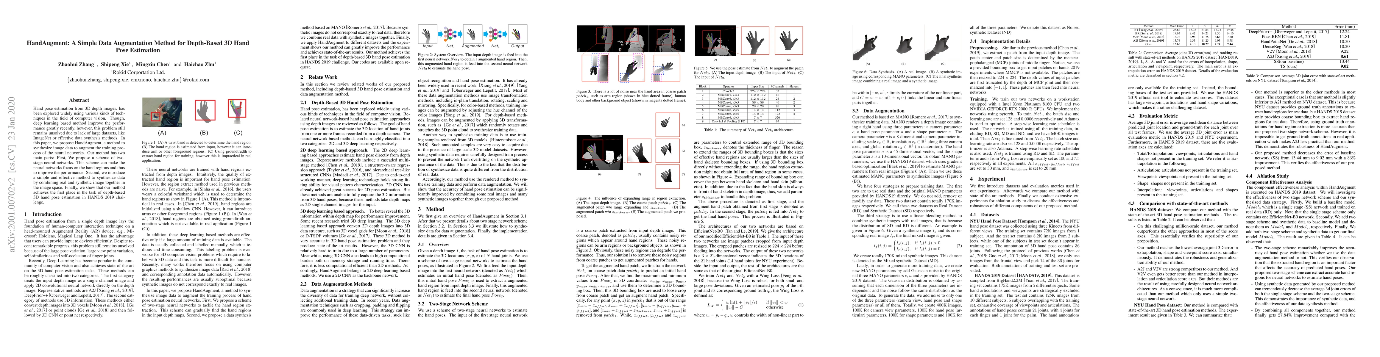 Hand pose estimation from 3D depth images, has been explored widely using various kinds of techniques in the field of computer vision. Though, deep learning based method improve the performance greatly recently, however, this problem still remains unsolved due to lack of large datasets, like ImageNet or effective data synthesis methods. In this paper, we propose HandAugment, a method to synthesize image data to augment the training process of the neural networks. Our method has two main parts: First, We propose a scheme of two-stage neural networks. This scheme can make the neural networks focus on the hand regions and thus to improve the performance. Second, we introduce a simple and effective method to synthesize data by combining real and synthetic image together in the image space. Finally, we show that our method achieves the first place in the task of depth-based 3D hand pose estimation in HANDS 2019 challenge.