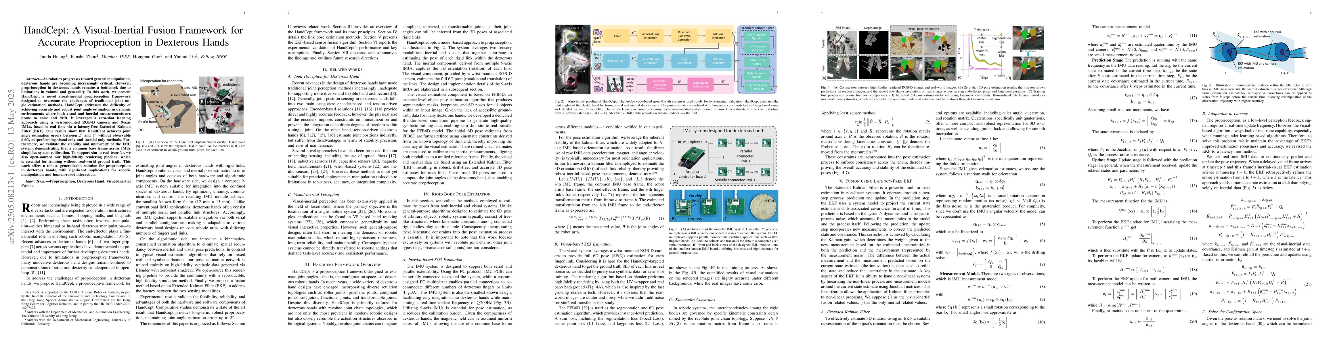 HandCept presents a novel fusion framework for accurate proprioception in dexterous hands, combining visual and inertial data through a latency-free EKF.
