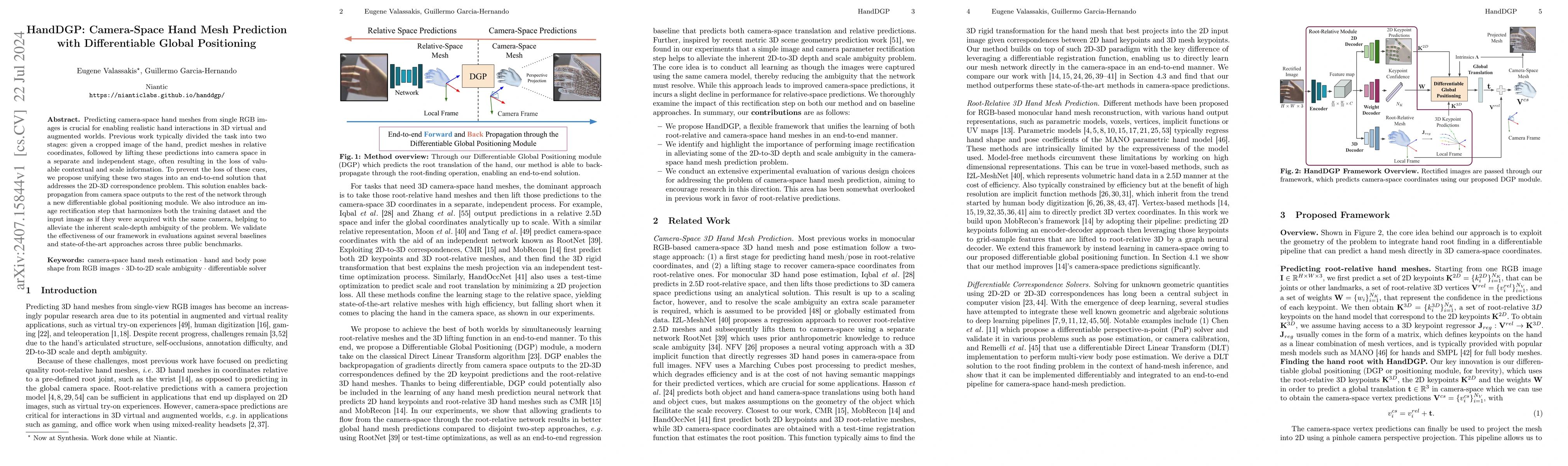 The paper proposes an end-to-end approach for predicting camera-space hand meshes directly from single RGB images, integrating a differentiable global positioning module to preserve contextual and scale information, and validates its effectiveness against baselines and state-of-the-art methods. The method includes an image rectification step to resolve scale-depth ambiguity, showing superior performance across multiple benchmarks.