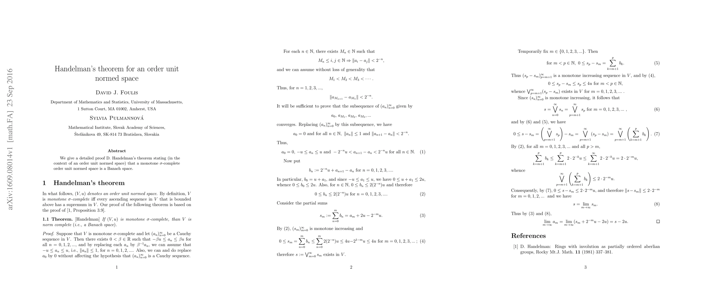 **Summary:** This paper provides a rigorous proof of Handelman's theorem, demonstrating that a monotone sigma-complete order unit normed space is a Banach space, thereby establishing its completeness in the normed space context.