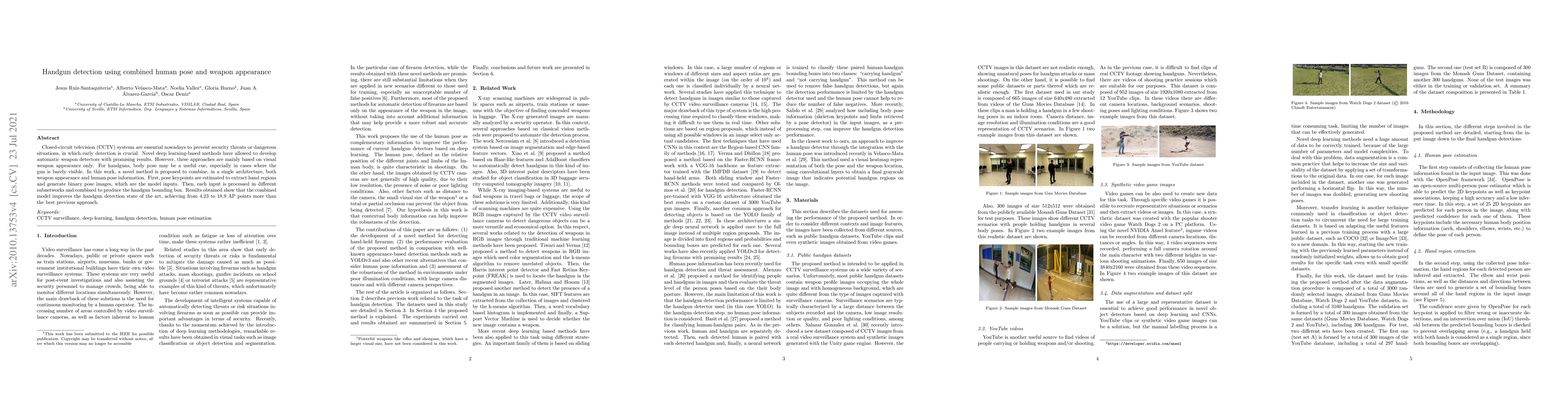 This research proposes a novel deep learning method for handgun detection in CCTV footage by combining human pose and weapon appearance information. The method estimates pose keypoints to extract hand regions and uses both pose and appearance data in separate subnetworks, which are then combined to produce accurate handgun detections, significantly outperforming previous methods.