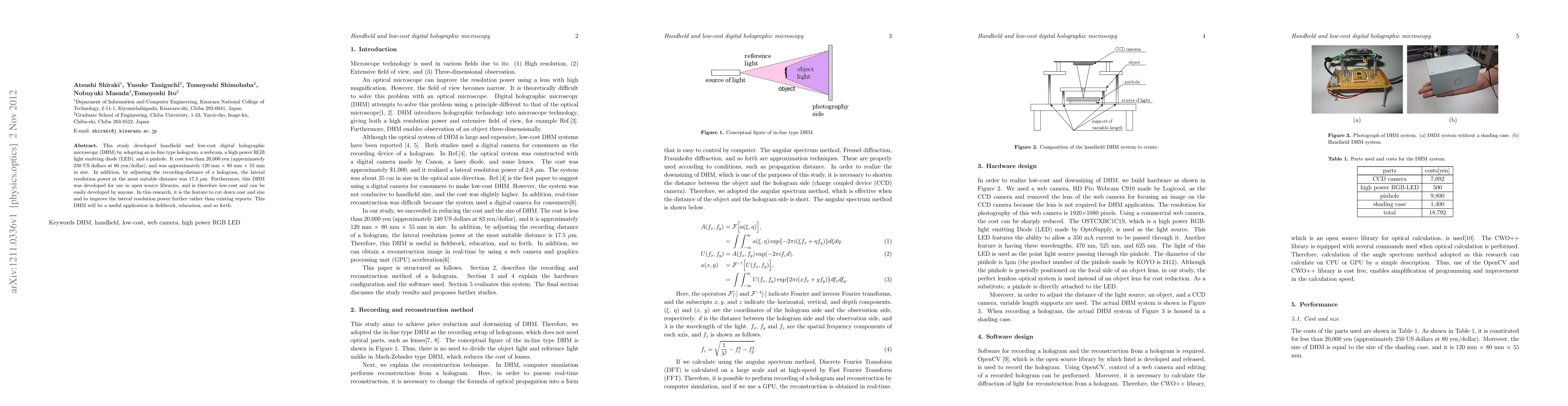 This study developed a handheld, low-cost digital holographic microscopy (DHM) using an in-line hologram, webcam, high-power RGB LED, and pinhole, costing less than 250 USD. It achieved a lateral resolution of 17.5 µm and is designed for easy development and use in fieldwork and education.