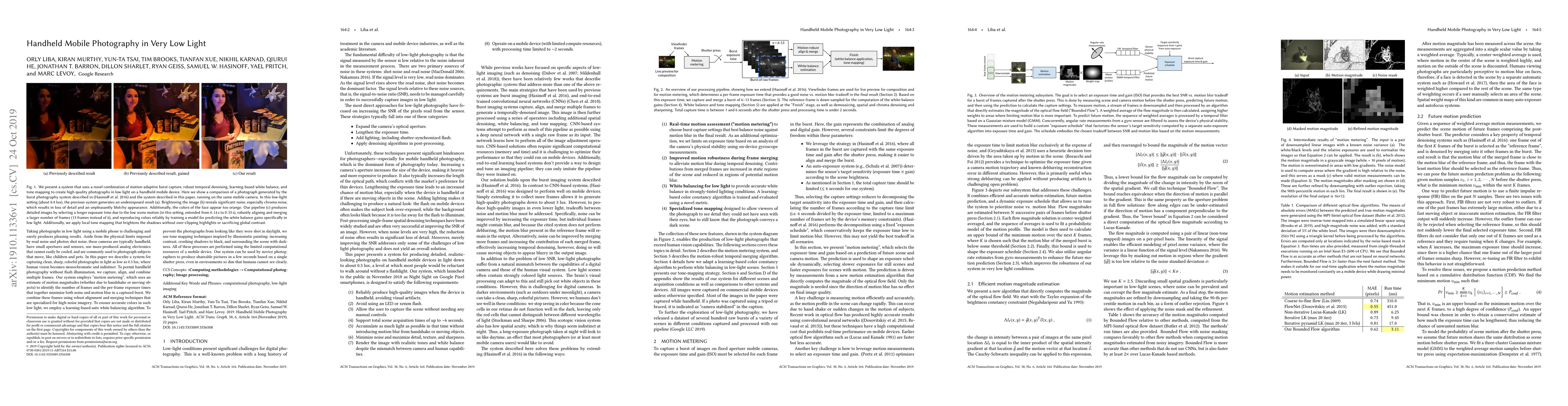 This paper presents a system for capturing clear, sharp, and colorful handheld mobile photographs in extremely low light conditions down to 0.3 lux, employing multiple frame capture, motion metering, robust alignment, and specialized merging techniques, along with learning-based auto white balancing and tone mapping to produce visually appealing images. The system operates within the computational constraints of a mobile device, enabling novice photographers to take shareable pictures in very dim environments.