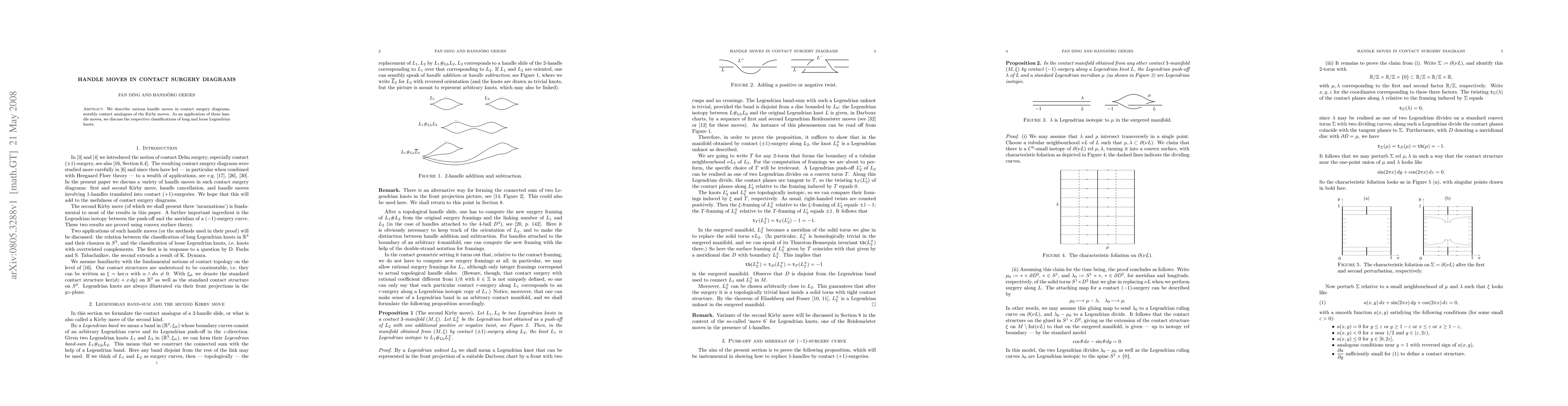 We describe various handle moves in contact surgery diagrams, notably contact analogues of the Kirby moves. As an application of these handle moves, we discuss the respective classifications of long and loose Legendrian knots.
