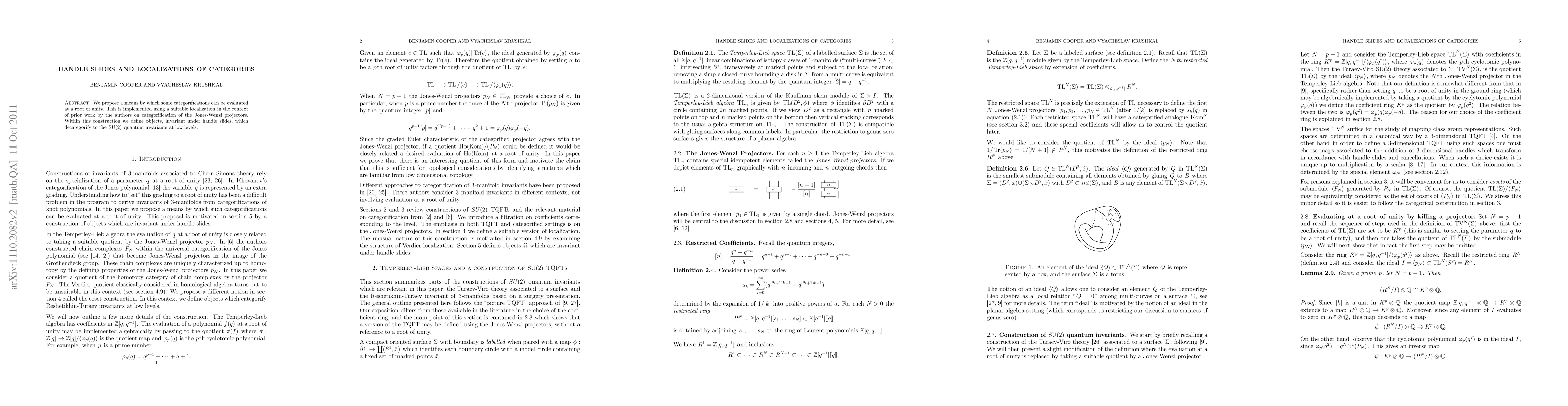 This paper proposes a method to evaluate certain categorifications at a root of unity through localization, extending prior work on categorifying the Jones-Wenzl projectors. It introduces objects invariant under handle slides that decategorify to SU(2) quantum invariants at low levels.
