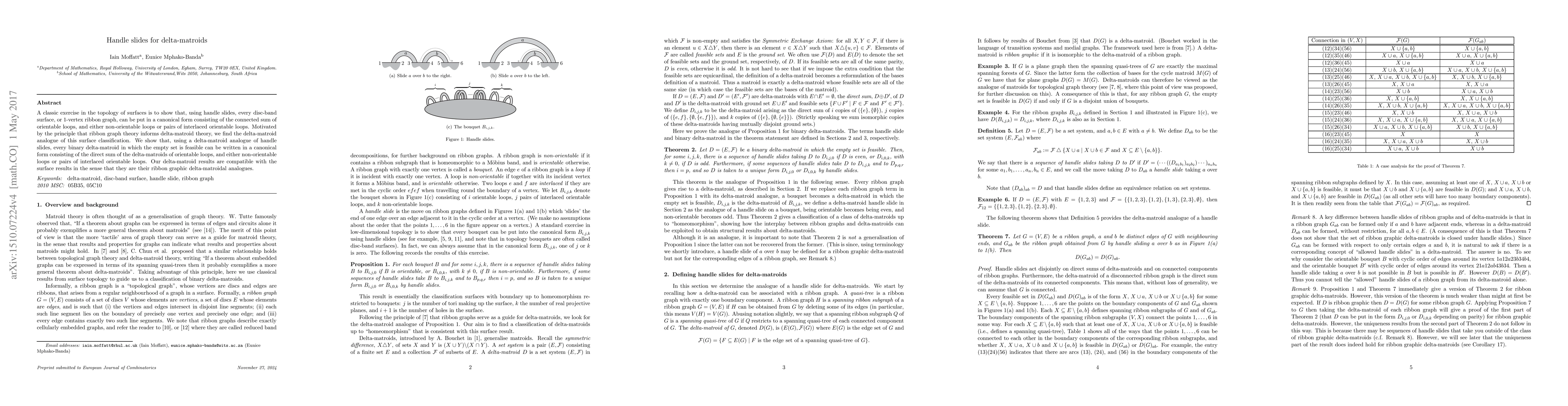 A classic exercise in the topology of surfaces is to show that, using handle slides, every disc-band surface, or 1-vertex ribbon graph, can be put in a canonical form consisting of the connected sum of orientable loops, and either non-orientable loops or pairs of interlaced orientable loops. Motivated by the principle that ribbon graph theory informs delta-matroid theory, we find the delta-matroid analogue of this surface classification. We show that, using a delta-matroid analogue of handle-slides, every binary delta-matroid in which the empty set is feasible can be written in a canonical form consisting of the direct sum of the delta-matroids of orientable loops, and either non-orientable loops or pairs of interlaced orientable loops. Our delta-matroid results are compatible with the surface results in the sense that they are their ribbon graphic delta-matroidal analogues.