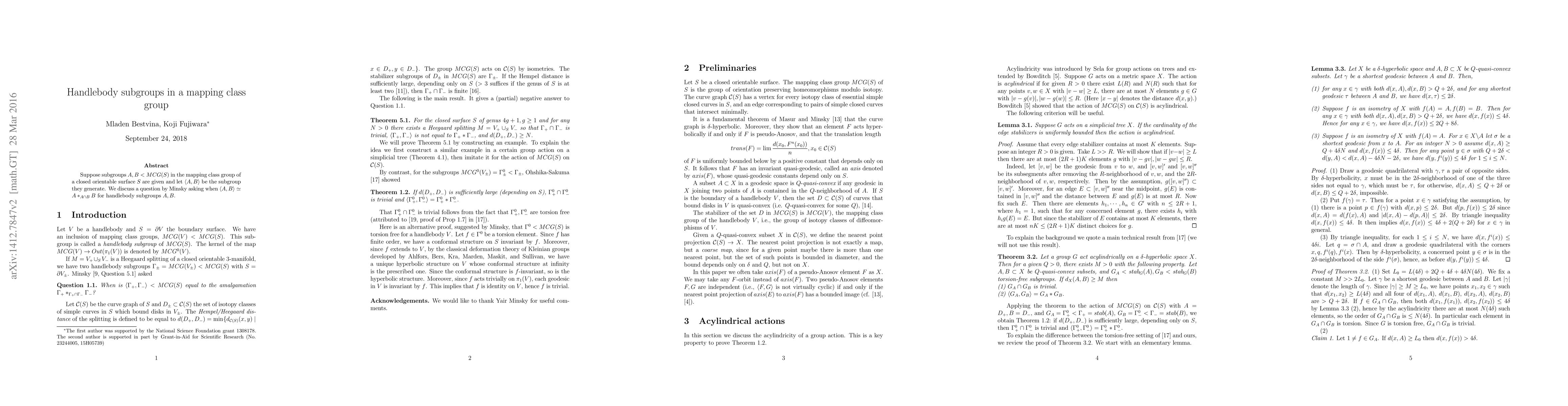 Researchers explore when handlebody subgroups A and B in a mapping class group satisfy a specific relationship, shedding light on a question posed by mathematician Minsky. The study focuses on the conditions under which the subgroup generated by A and B is equivalent to their intersection-free amalgam.