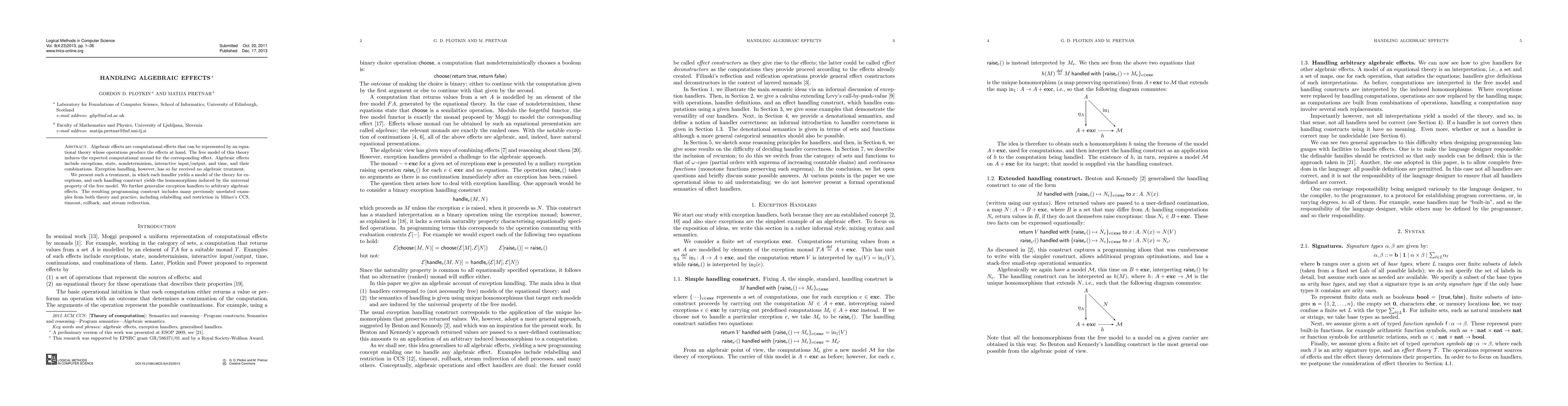 The paper introduces an algebraic treatment for handling computational effects, including exceptions, state, and nondeterminism, through an equational theory. It generalizes exception handling and unifies various effect handling constructs under a single framework.