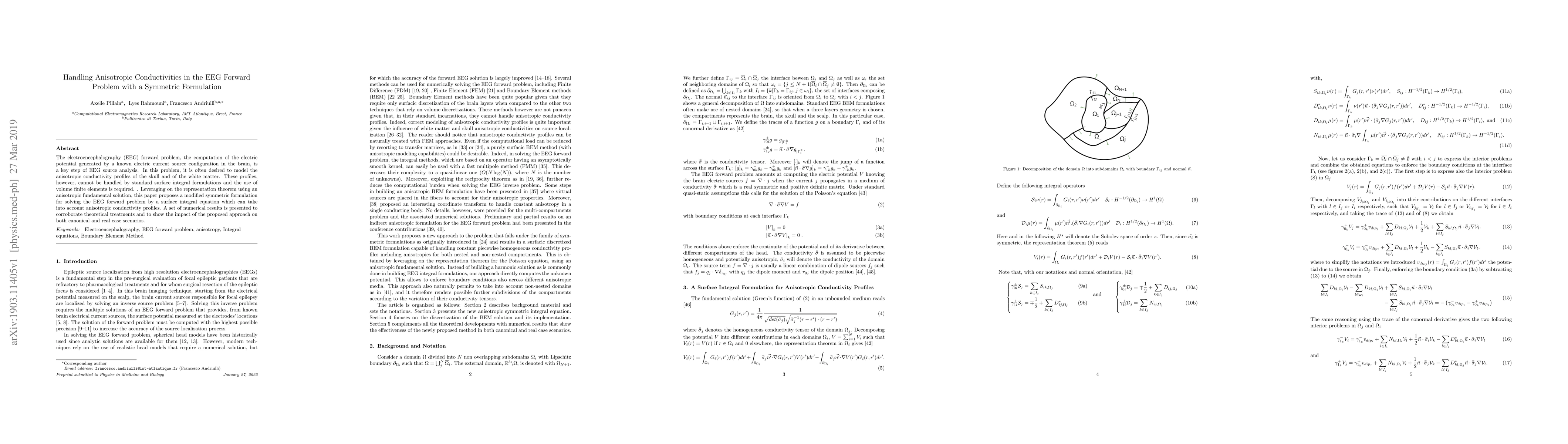 This paper proposes a modified symmetric formulation for solving the EEG forward problem using a surface integral equation that accommodates anisotropic conductivity profiles of the skull and white matter, replacing traditional surface integral formulations. Numerical results demonstrate the effectiveness of the proposed approach in both theoretical and real-world scenarios.