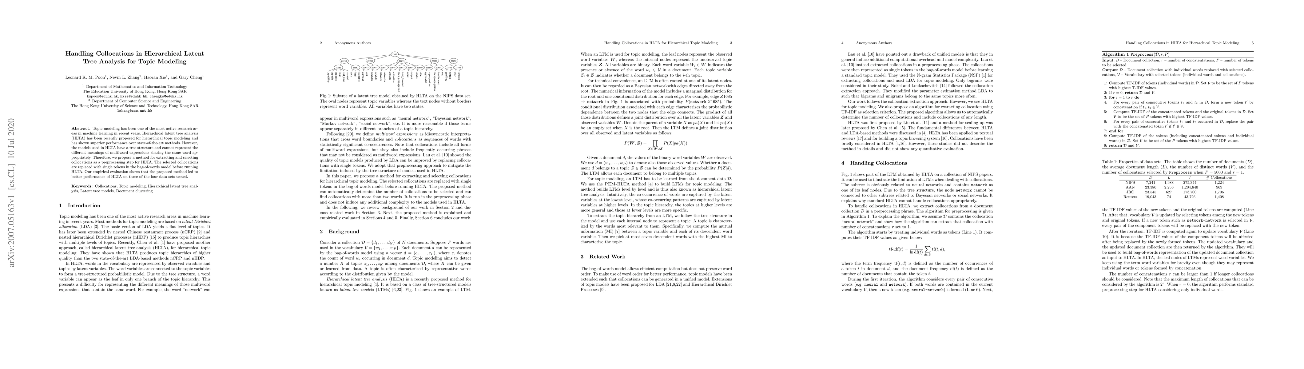 This paper proposes a method to extract and select collocations as a preprocessing step for Hierarchical Latent Tree Analysis (HLTA) in topic modeling, replacing them with single tokens to better represent multiword expressions. Empirical results show improved HLTA performance on three out of four datasets tested.