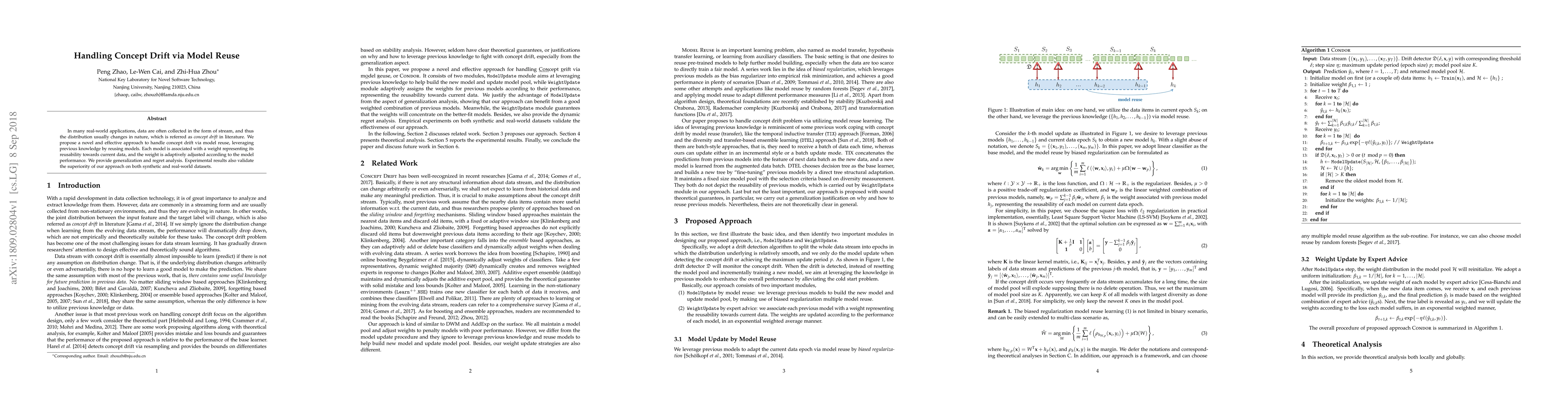 This paper proposes a novel approach to handle concept drift in data streams by reusing previous models, with adaptively adjusted weights based on model performance. The method is shown to outperform others through generalization and regret analysis, as well as experimental validation on both synthetic and real-world datasets.