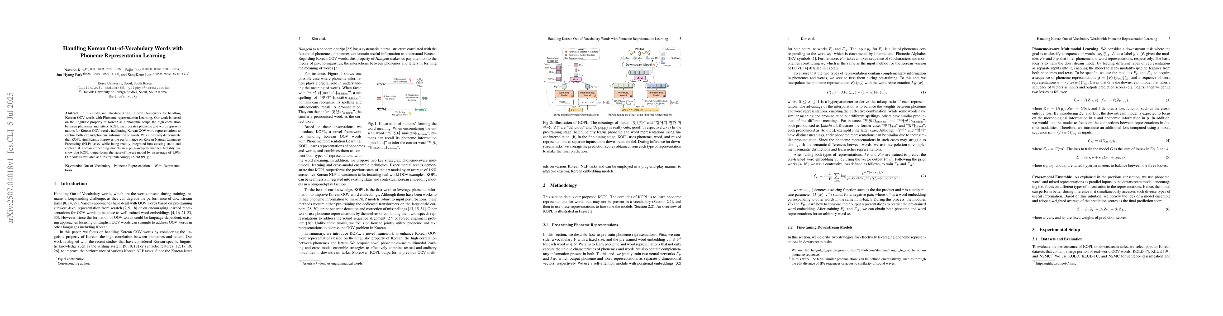 In this study, we introduce KOPL, a novel framework for handling Korean OOV words with Phoneme representation Learning. Our work is based on the linguistic property of Korean as a phonemic script, the high correlation between phonemes and letters. KOPL incorporates phoneme and word representations for Korean OOV words, facilitating Korean OOV word representations to capture both text and phoneme information of words. We empirically demonstrate that KOPL significantly improves the performance on Korean Natural Language Processing (NLP) tasks, while being readily integrated into existing static and contextual Korean embedding models in a plug-and-play manner. Notably, we show that KOPL outperforms the state-of-the-art model by an average of 1.9%. Our code is available at https://github.com/jej127/KOPL.git.