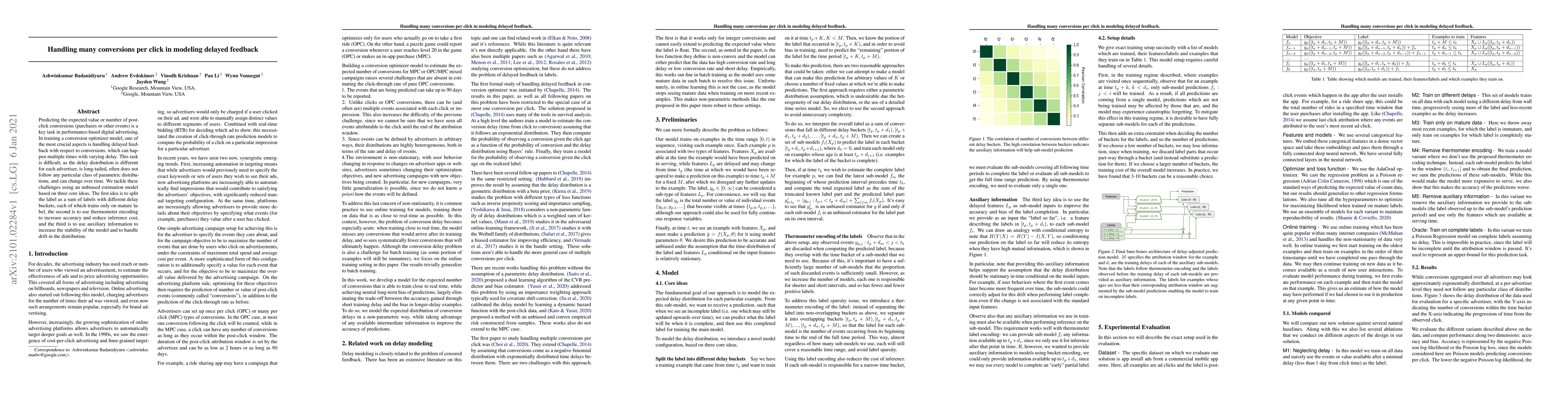 This paper proposes a method to predict post-click conversions in digital advertising by addressing the challenge of delayed feedback. It uses an unbiased estimation model with three core ideas: splitting labels into delay buckets, thermometer encoding for accuracy, and auxiliary information to manage distribution drift.