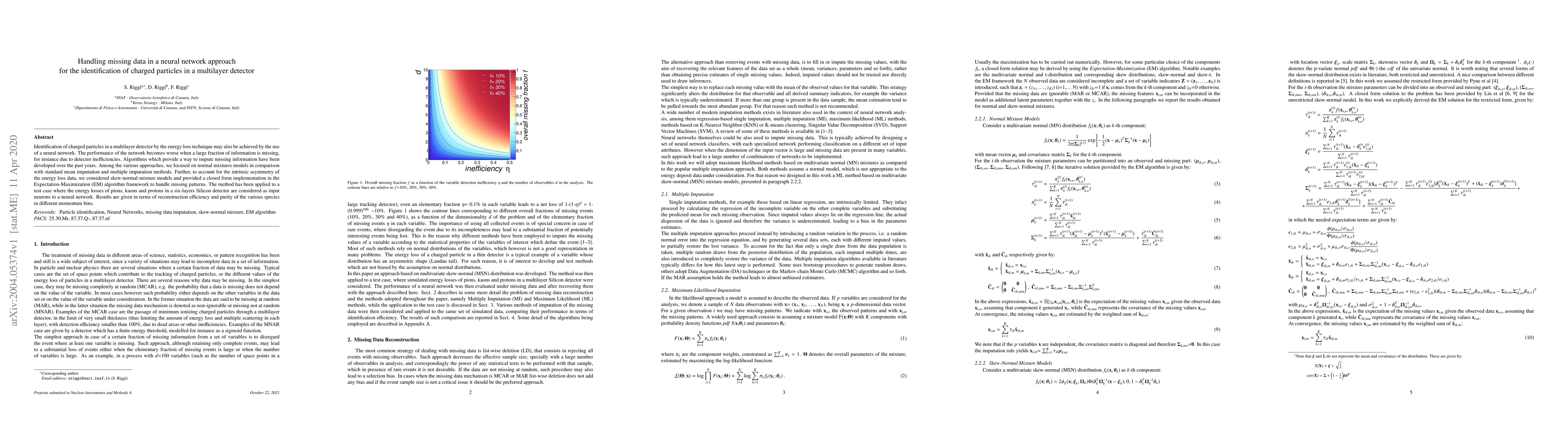 Identification of charged particles in a multilayer detector by the energy loss technique may also be achieved by the use of a neural network. The performance of the network becomes worse when a large fraction of information is missing, for instance due to detector inefficiencies. Algorithms which provide a way to impute missing information have been developed over the past years. Among the various approaches, we focused on normal mixtures models in comparison with standard mean imputation and multiple imputation methods. Further, to account for the intrinsic asymmetry of the energy loss data, we considered skew-normal mixture models and provided a closed form implementation in the Expectation-Maximization (EM) algorithm framework to handle missing patterns. The method has been applied to a test case where the energy losses of pions, kaons and protons in a six-layers Silicon detector are considered as input neurons to a neural network. Results are given in terms of reconstruction efficiency and purity of the various species in different momentum bins.