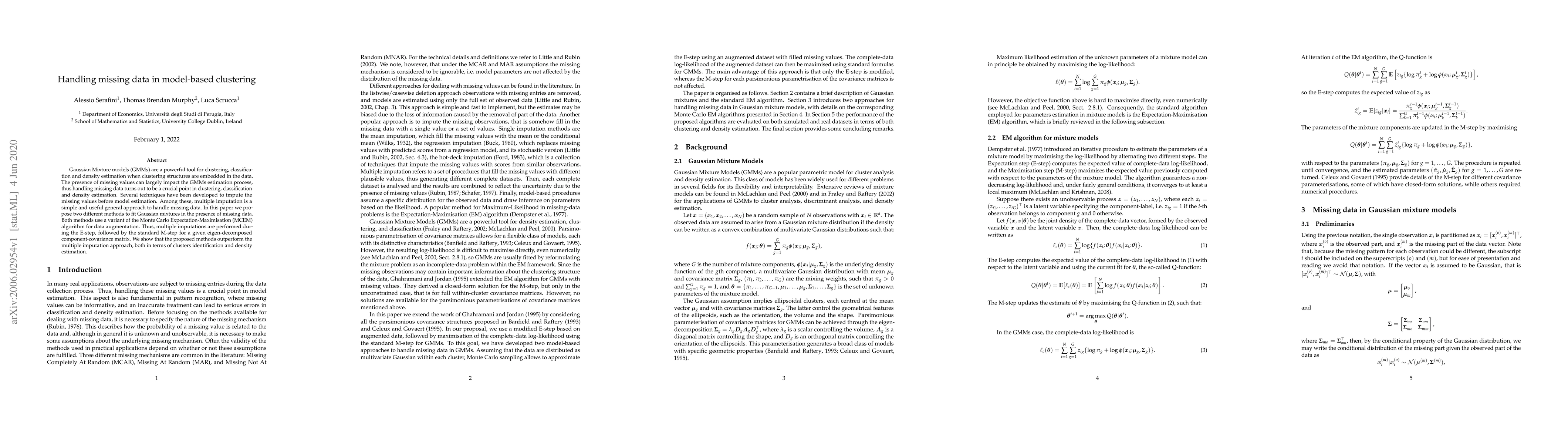 This paper proposes two methods to fit Gaussian Mixture Models (GMMs) in the presence of missing data using a variant of the Monte Carlo Expectation-Maximisation (MCEM) algorithm. The methods outperform traditional multiple imputation approaches in both cluster identification and density estimation.