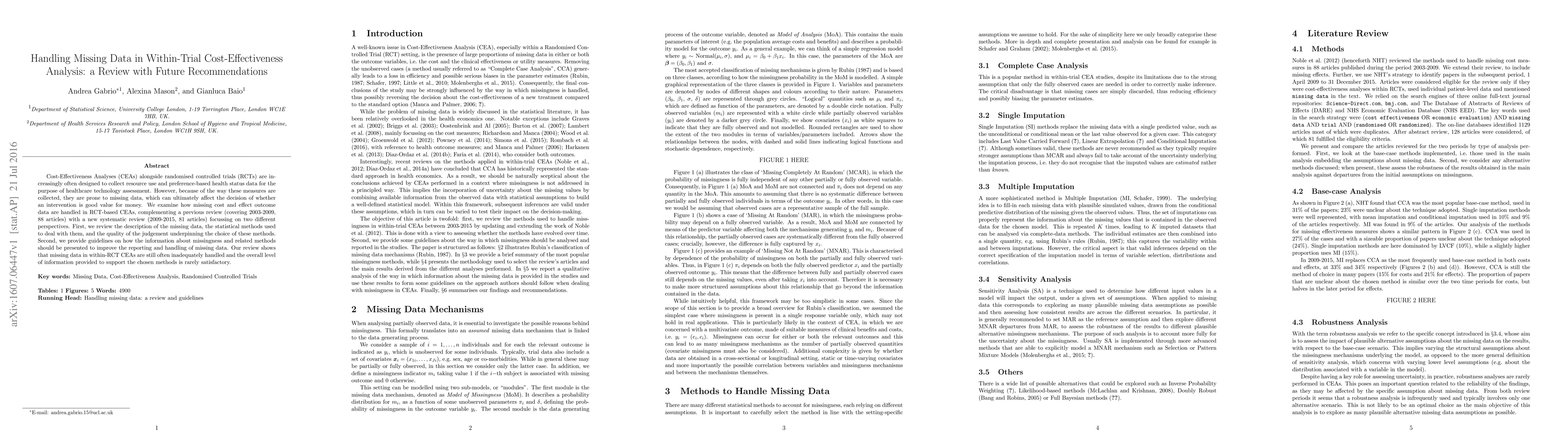 Cost-Effectiveness Analyses (CEAs) alongside randomised controlled trials (RCTs) are increasingly often designed to collect resource use and preference-based health status data for the purpose of healthcare technology assessment. However, because of the way these measures are collected, they are prone to missing data, which can ultimately affect the decision of whether an intervention is good value for money. We examine how missing cost and effect outcome data are handled in RCT-based CEAs, complementing a previous review (covering 2003-2009, 88 articles) with a new systematic review (2009-2015, 81 articles) focussing on two different perspectives. First, we review the description of the missing data, the statistical methods used to deal with them, and the quality of the judgement underpinning the choice of these methods. Second, we provide guidelines on how the information about missingness and related methods should be presented to improve the reporting and handling of missing data. Our review shows that missing data in within-RCT CEAs are still often inadequately handled and the overall level of information provided to support the chosen methods is rarely satisfactory.