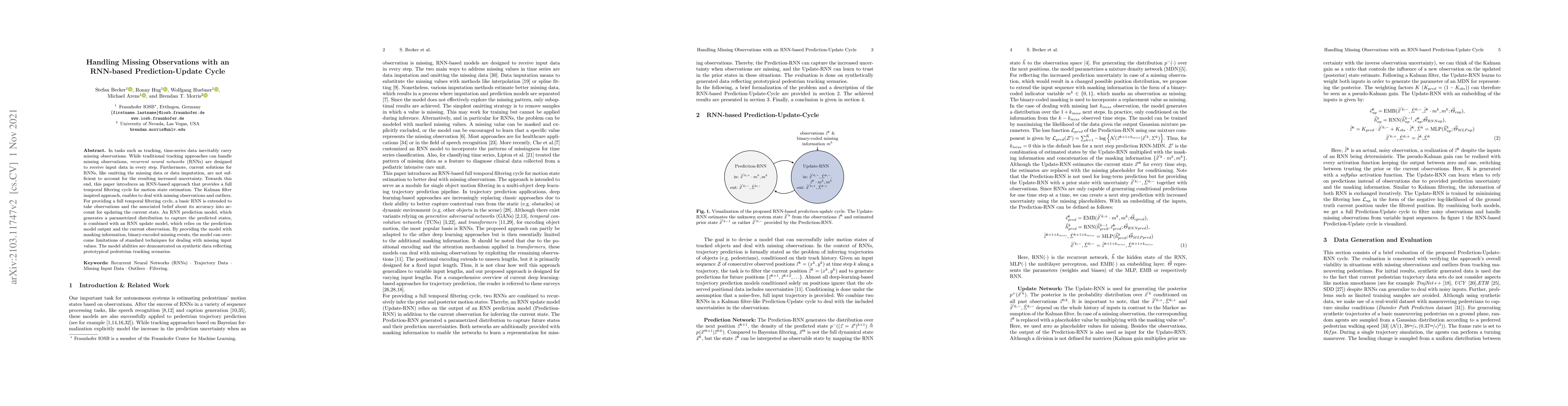 This paper proposes an RNN-based prediction-update cycle for handling missing observations in time-series data, inspired by the Kalman filter. It integrates a prediction model with an update model to manage missing data and uncertainties, demonstrating effectiveness in synthetic pedestrian tracking scenarios.