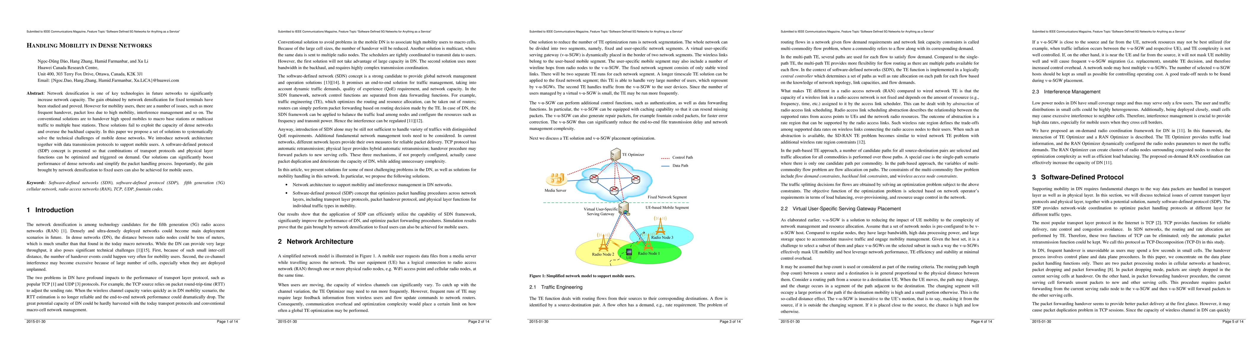 This paper proposes solutions to address technical challenges in mobile dense networks, including frequent handovers and interference management. The authors introduce a network architecture and software-defined protocol to optimize data transmission, aiming to enhance performance and simplify packet handling for mobile users while leveraging network densification benefits.